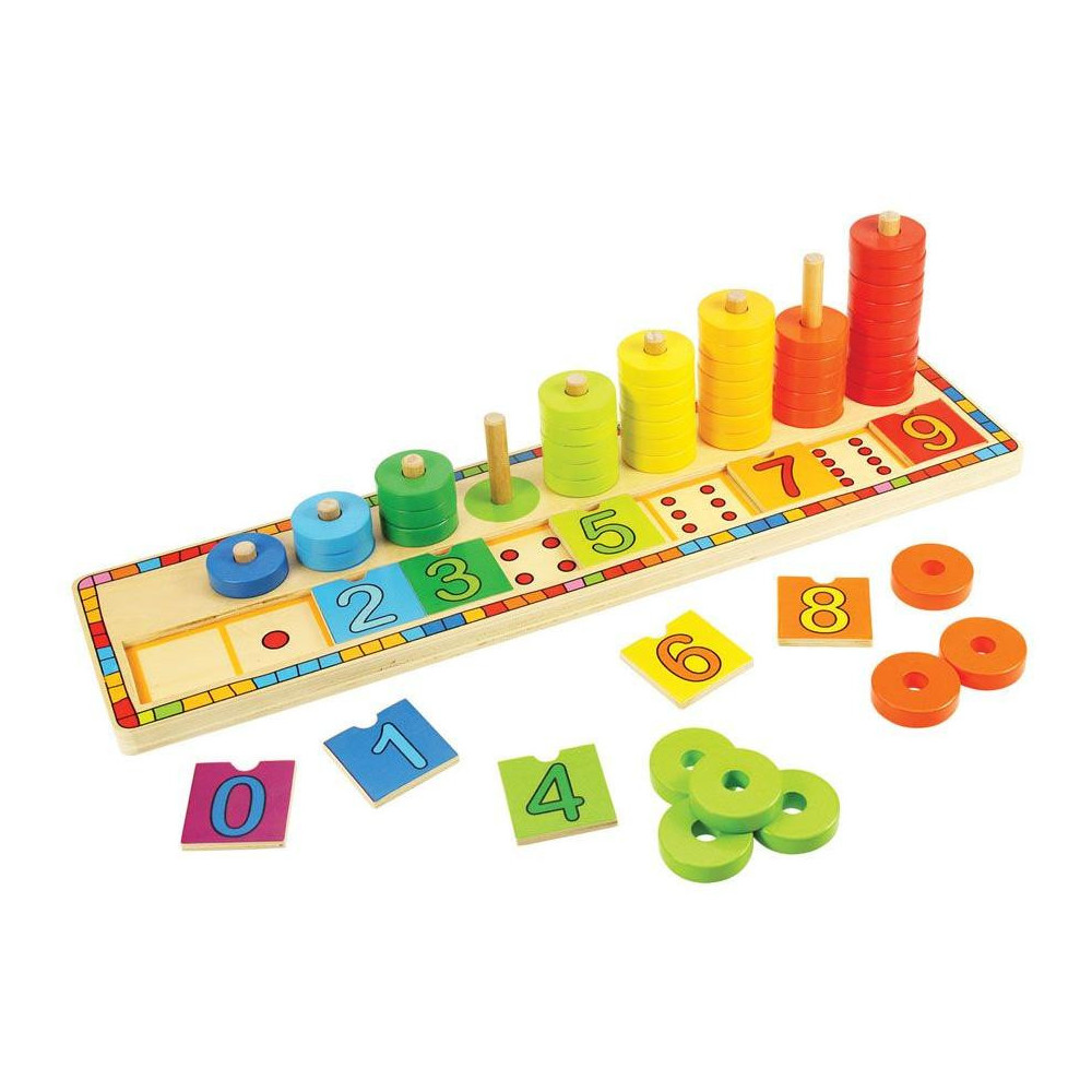 Vaše děti budou milovat tuto velmi aktivní hračku, která obsahuje spoustu barevných disků, které se dají nasouvat na sebe po dřevěné tyčce, a číslic, jež se vkládají do dřevěné destičky.