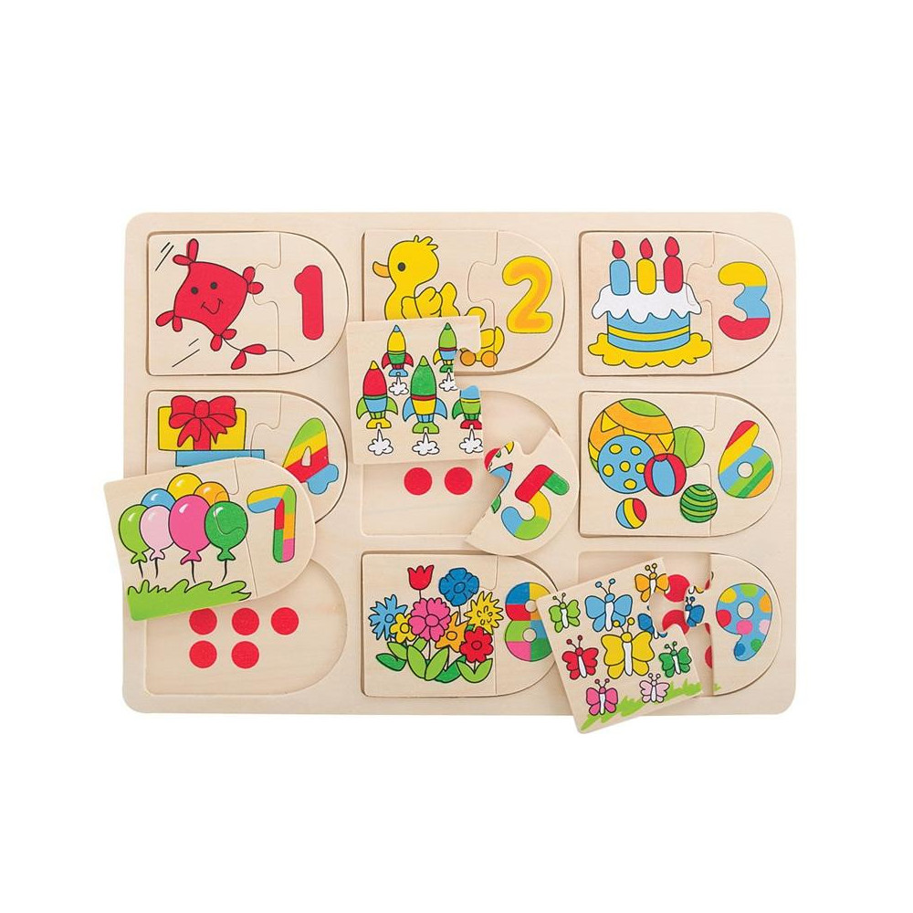 Vaši malí zvědavci budou určitě milovat tohle malé, zajímavé a chytré puzzle. Nejen, že je bude bavit třídit kousky do správných míst, ale mohou vkládat jen samotné obrázky a k nim pak přiřadit ta správna čísla. Každý kousek dřevěné skládačky je dimenzovaný tak, aby usnadnil zvedání, uchopení v malé dětské ručičce. Puzzle jsou potištěny obrázky nebo barvami, které napomáhají procesu učení a dodávají vzdělávací hodnotu. Skvělý způsob, jak rozvíjet obratnost, rozpoznávání tvarů, koncentraci a počítání již od útlého věku.