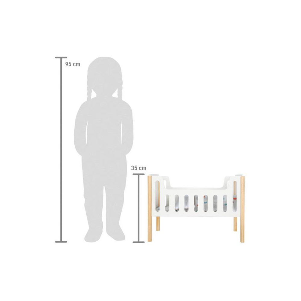 Tato moderní dřevěná postýlka pro panenky ve skandinávském lineárním designu je ideální postýlkou pro uspávání panenek nebo plyšáků. Má vysoce kvalitní zpracování se zaoblenými hranami a viditelnými prvky z masivního dřeva. Součástí je oboustranné povlečení s velkou přikrývkou, které umožňuje pohodlné spaní i větším panenkám nebo plyšovým hračkám do velikosti 46 cm. Zvýšená plocha na ležení pro panenky umožňuje ergonomickou hru. Díky decentnímu designu z neutrální bílé v kombinaci s přírodním dřevem se tato stabilní postýlka skvěle hodí do každého interiéru obývacího pokoje nebo dětského pokoje.