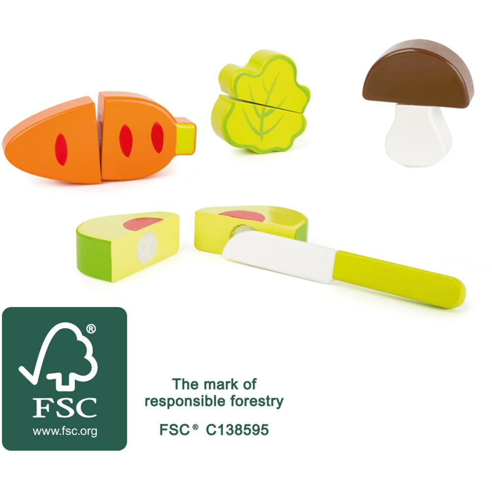Barevný mix zeleniny. S touto dřevěnou sadou se děti naučí krájet zeleninu a aranžovat jídlo. Hračka je vyrobena z FSC® certifikovaného dřeva. Části zeleniny jsou k sobě připojeny suchým zipem a lze je jednoduše „rozříznout“ dřevěným nožem. Perfektní doplněk do dětských kuchyněk. Obsahuje 1 nůž, 2 poloviny avokáda, 2 poloviny listů salátu, 2 poloviny mrkve, 2 poloviny hub. Hlavní vlastnosti:
