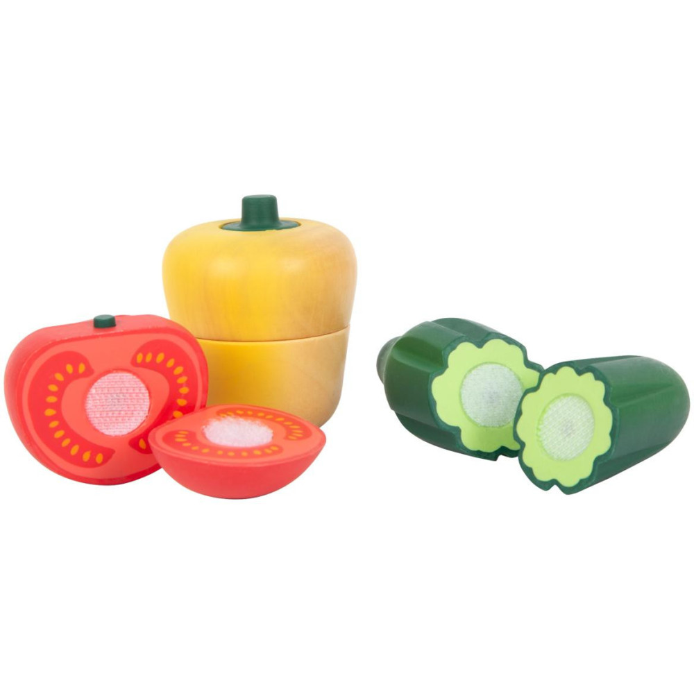 Je opravdu důležité naučit se správnou techniku krájení, s touto hračkou to půjde jako po másle. Paprika, žampion, rajče, okurka a mrkev – v této sadě je vše! Přirozeně vypadající a detailní zelenina drží dohromady pomocí suchého zipu. Díky udržitelnému obalu se děti naučí něco nového o ekologii. Krájecí prkénko lze díky oka pověsit.