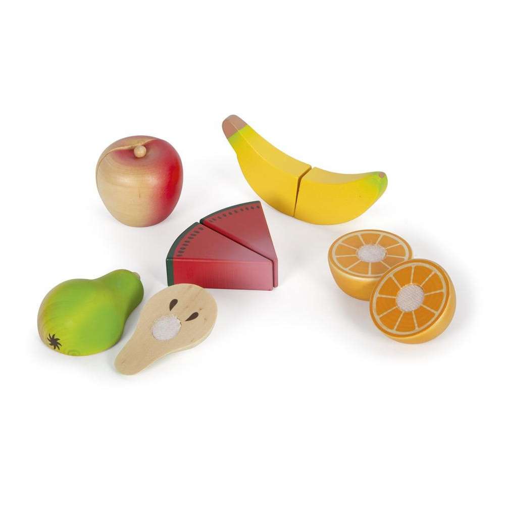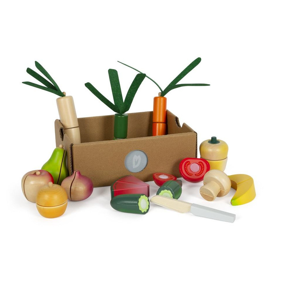 Tato velká sada potravin v praktické bedýnce je nejen nezbytným doplňkem každé kuchyňky, ale také naučí děti rozpoznat základní druhy ovoce a zeleniny a dalších potravin. Pro výrobu bylo použito robustní dřevo a vše je realisticky zpracováno. Potraviny jsou spojeny suchým zipem a děti je mohou snadno „rozkrojit“ pomocí přiloženého nože. Sada obsahuje dřevěný nůž, rajče, okurek, mrkev, jablko, banán, hříbek, papriku, cibuli, pórek, pomeranč, meloun, hrušku, ředkev (pastinák). Opakovaně použitelný obal učí děti zábavnou formou odpovědnosti k životnímu prostředí - omezit odpadky a plýtvání, znovu věci použít, recyklovat.