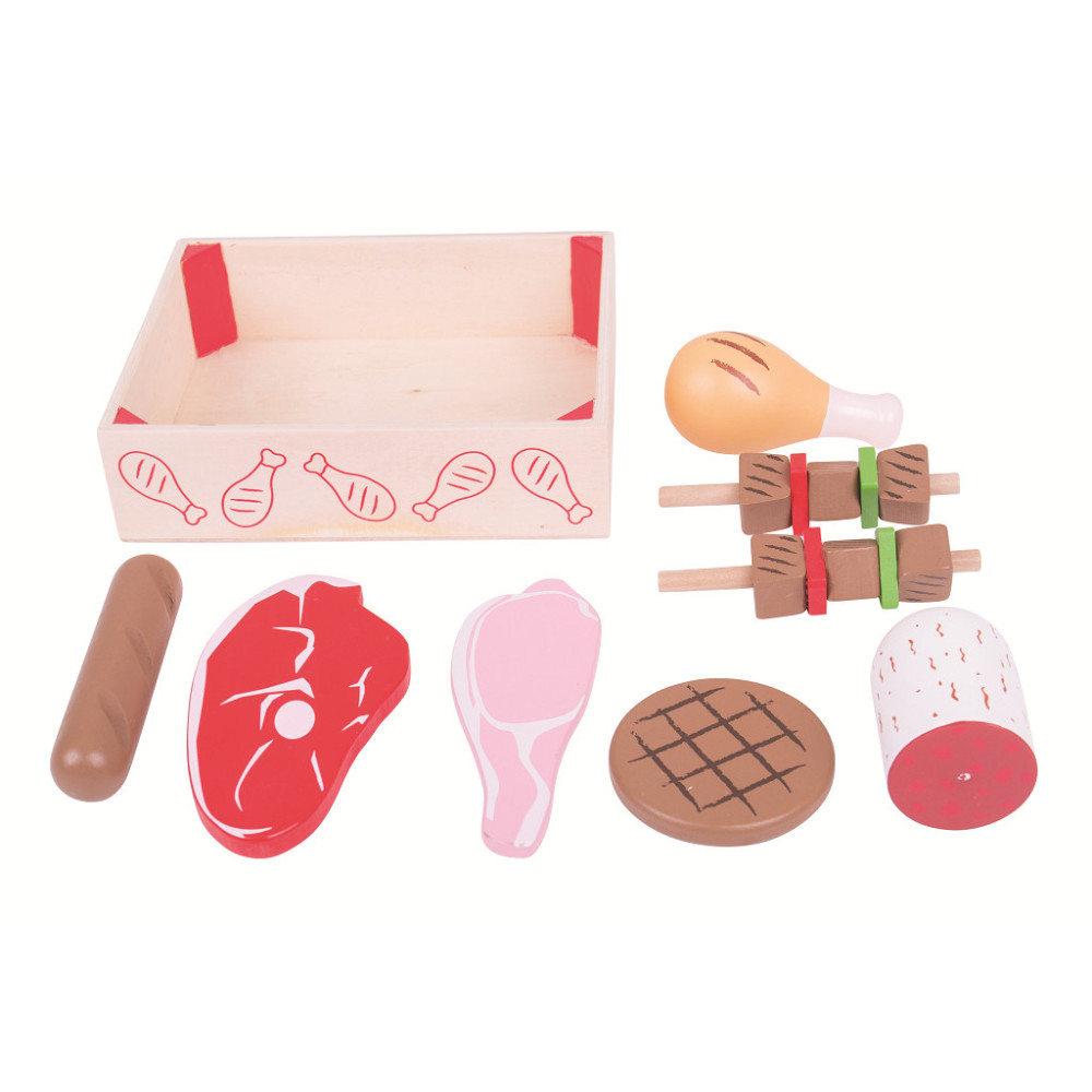 Tato dřevěná přepravka je plná čerstvého masa a uzenin od řezníků. Obsahuje výběr masa, jako je slanina, steak, klobása, kuře a další . Skvělý doplněk do dřevěné kuchyňky na hraní všech začínajících kuchařů. Bigjigs Toys dřevěné jídlo je ideální, aby pomohlo vašemu dítěti dozvědět se o významu zdravé a vyvážené stravy, odkud naše jídlo pochází a jak jej připravujeme. Po skončení hraní může být dřevěná strava uložena zpět do praktického boxu.