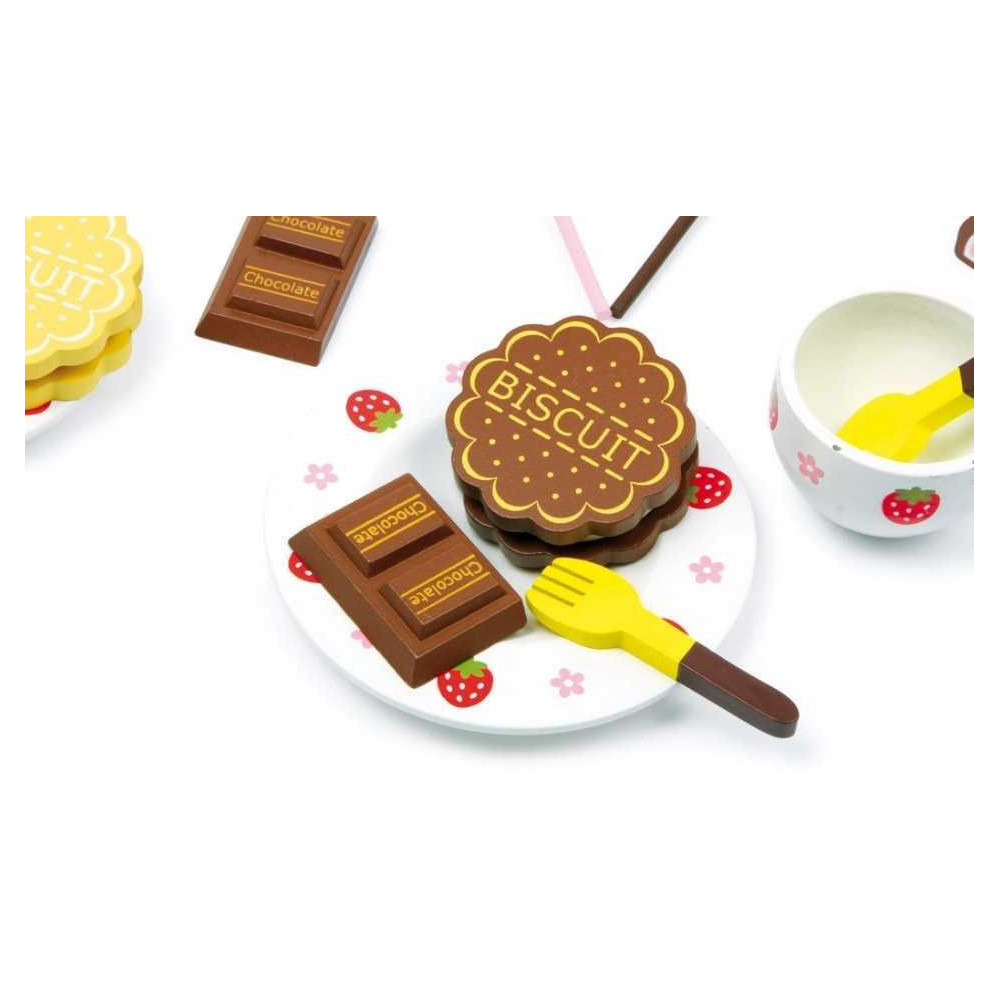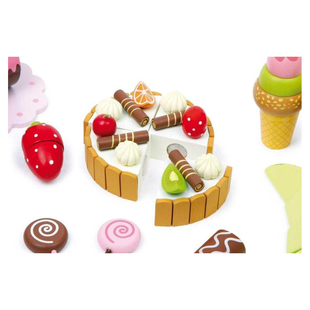 V tomto prostorném nádherně malovaném dřevěném boxu s víkem najdou děti bohatý výběr lahůdek! Potraviny jsou spojené suchým zipem a děti je mohou krájet dřevěným nožem.