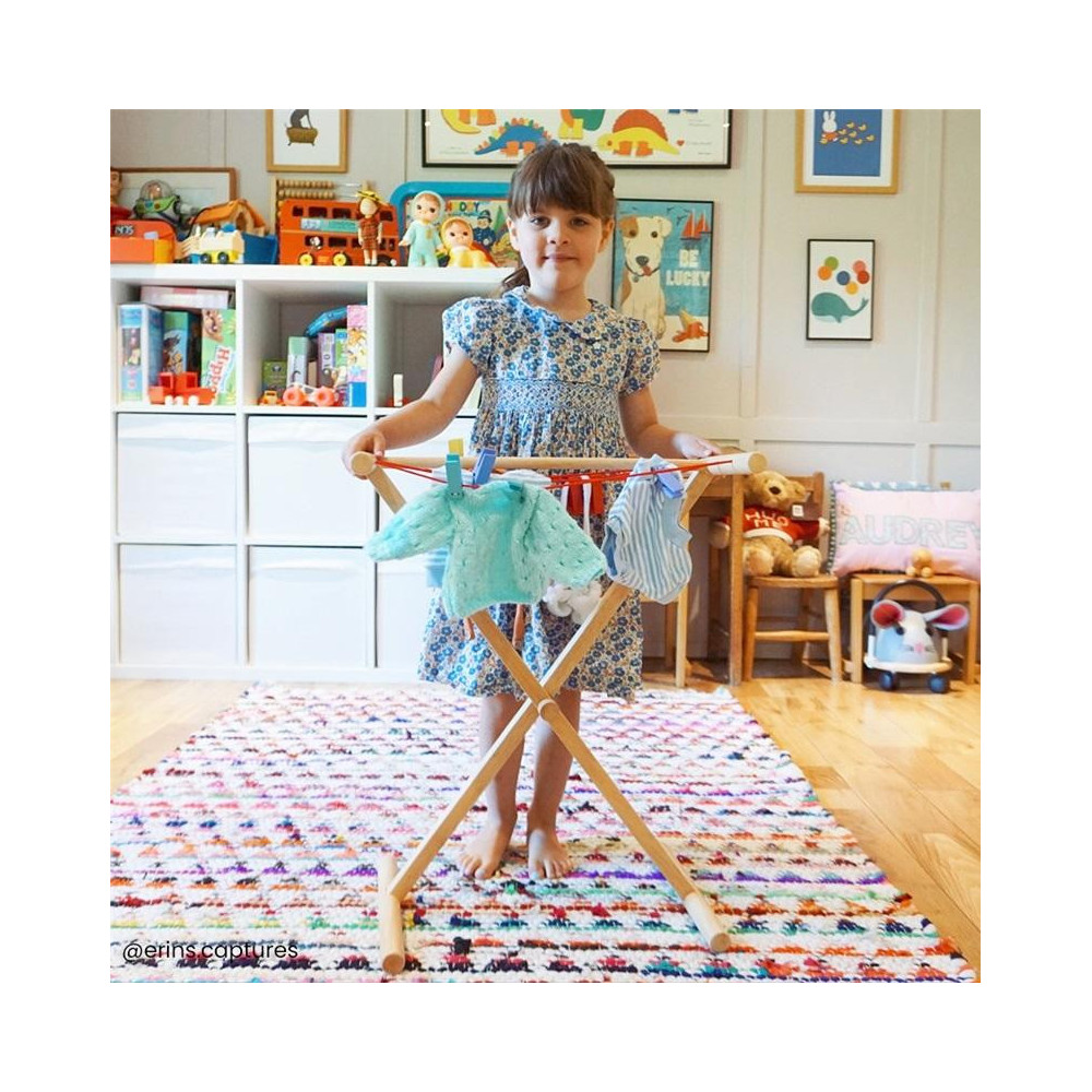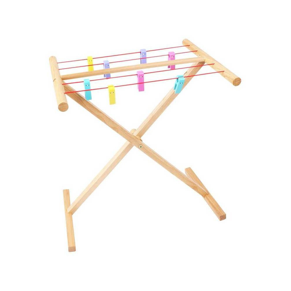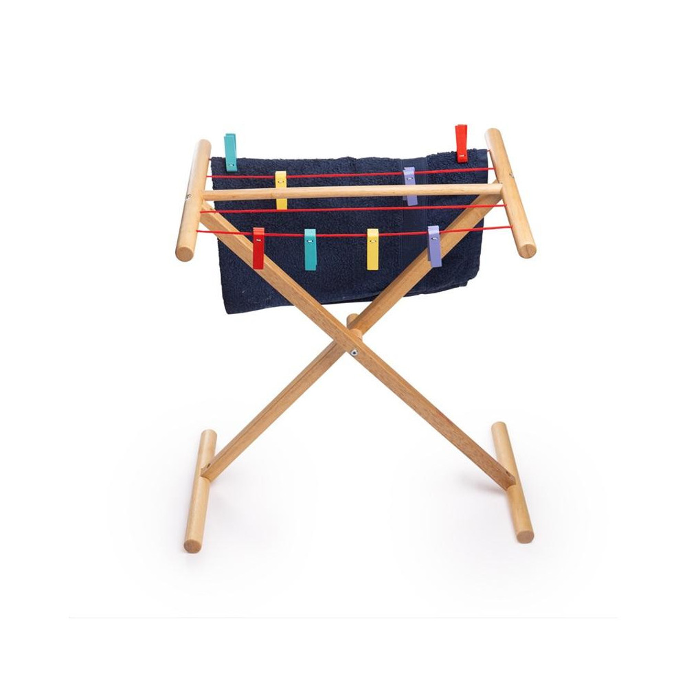 Tento dřevěný věšák na prádlo s pestrobarevnými mohutnými kolíčky je ideálním místem pro sušení oděvů. Ať už se vaše ratolest chce postarat o vlastní prádlo nebo třeba o oblečení svého plyšáka či panenky, je tu spousta volného místa! Zjistěte více o tom, co se děje při praní, a rozvíjejte realistické, zábavné herní role. Podporuje kreativní a nápadité hraní. Vyrobeno z vysoce kvalitních, zodpovědně získaných materiálů. Splňuje aktuální evropské bezpečnostní normy. Obsahuje 9 dílů.