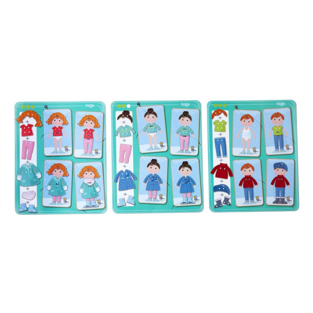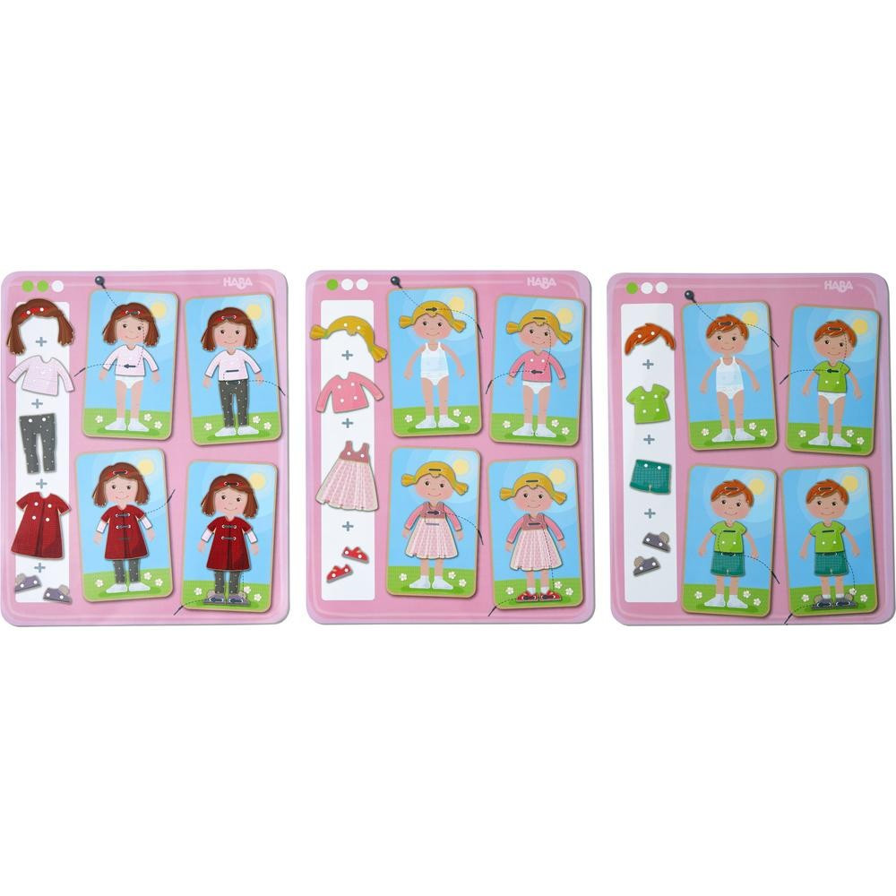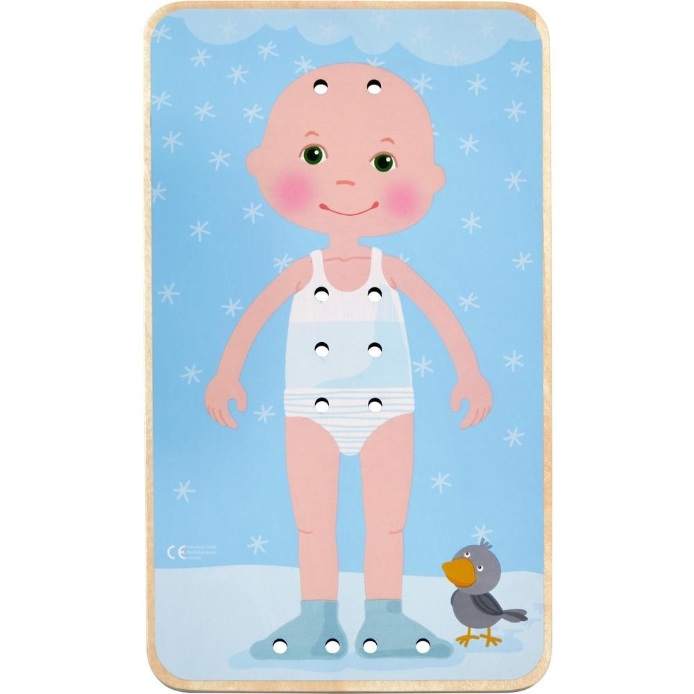 Šaty nebo kabát? Mokasíny nebo boty? Co mají dívky a chlapci oblečené v létě nebo v zimě? Děti se samy rozhodují při navlékání podle poskytnutých předloh nebo při volné hře, protože 36 různých druhů účesů a oblečení poskytuje nespočet kreativních kombinací. Hračka obsahuje: 1 oboustranně potištěnou desku na navlékání nití, 1 dlouhou nit, 36 závitových kartiček a 3 oboustranně potištěné předlohy. Vhodné pro děti: od 3 let Rozměr produktu: 31 x 0,5 x 18,5 cm Materiál: dřevo