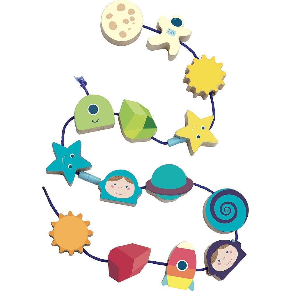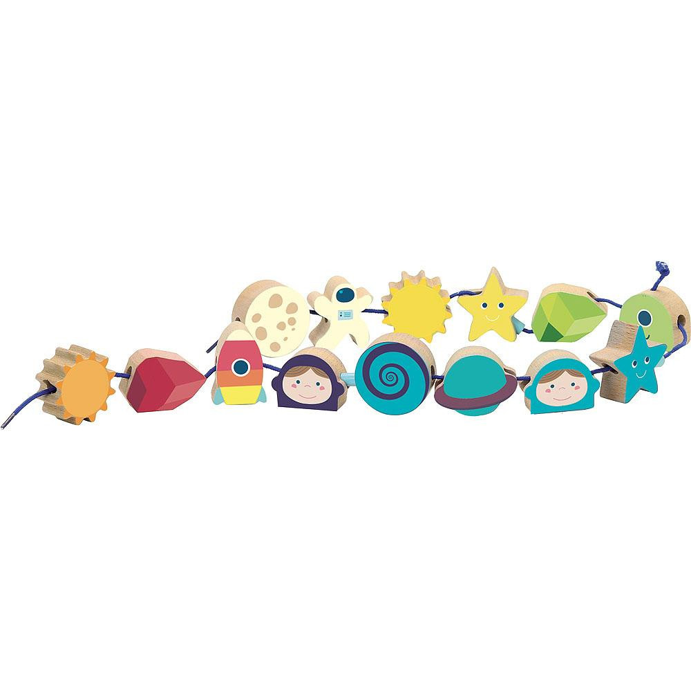 Krásná provlékačka v motivu vesmíru. V kompaktním balení najdete 14 ilustrovaných dřevěných korálků (např. astronaut, měsíc, slunce, raketa), které děti mohou navlékat na textilní šňůrku. Hračka pomáhá s rozvojem jemné motoriky. Vybaveno bezpečnostními sponami. Vhodné od 18 měsíců.