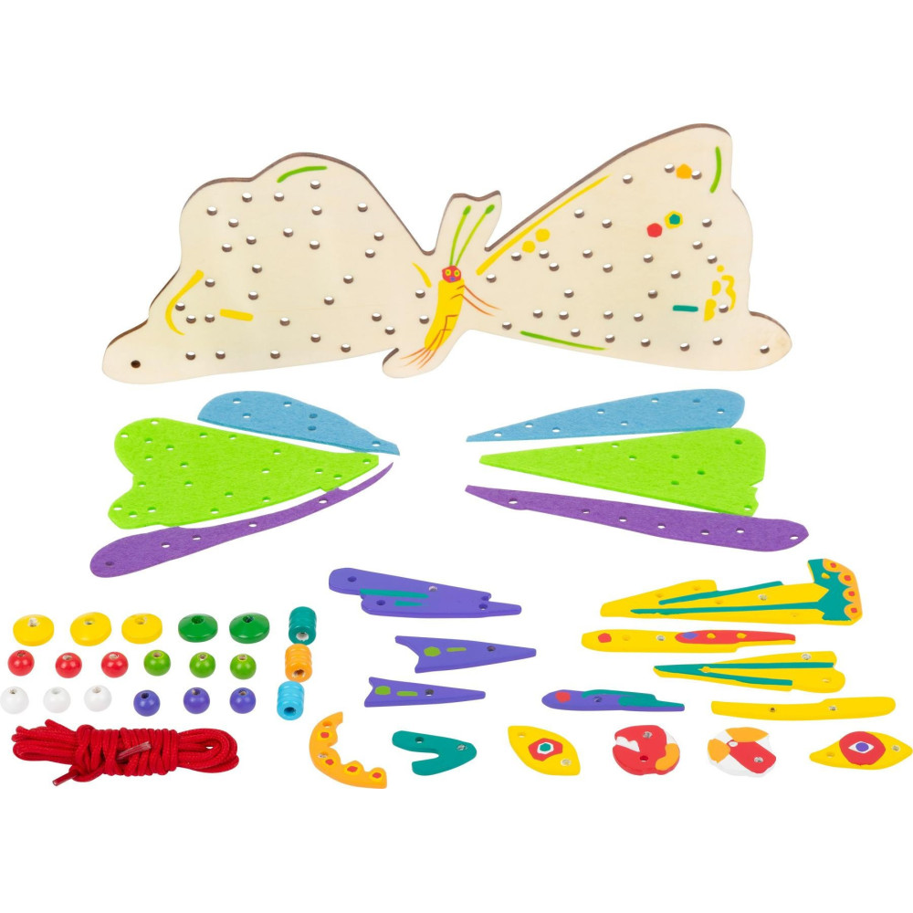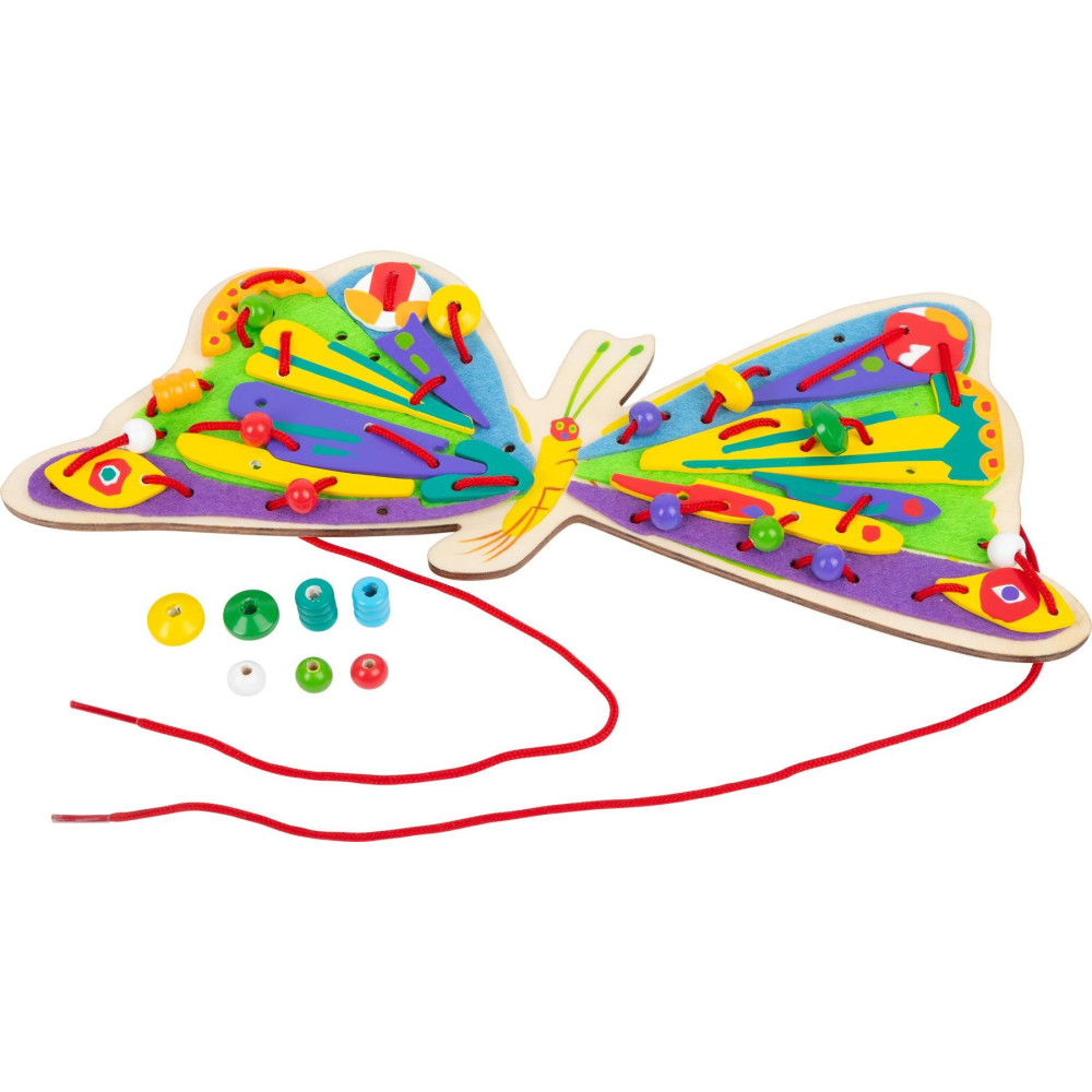 Z housenky barevným motýlem. Dřevěná provlékací hra děti inspiruje ke kreativitě. Na červený provázek děti navléknou korálky a poté je protahují plstěnými a dřevěnými prvky motýla. Který motýl je nejkrásnější? Hra trénuje jemnou motoriku dětí a jistě si s ní užijí dlouhotrvající zábavu. Vhodné také na cesty.