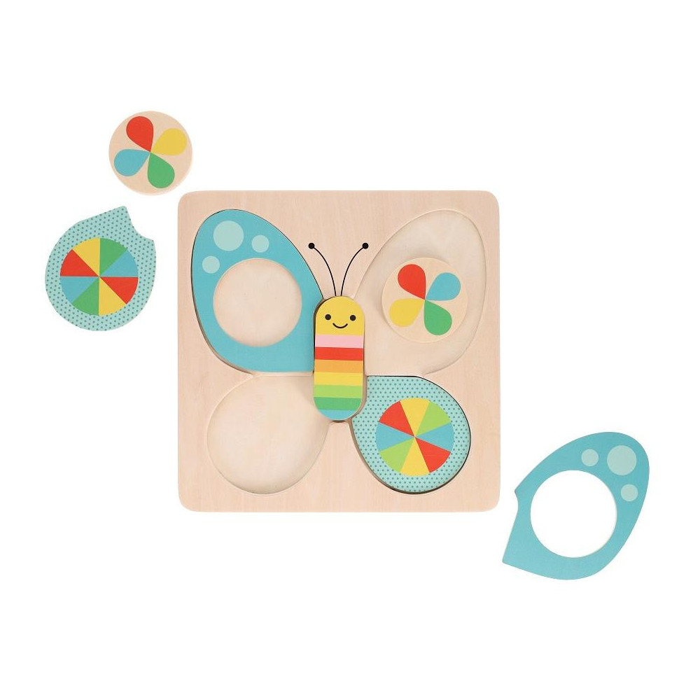 Postavte si přátelského motýla s duhovo-pastelovými barvičkami! Malé děti mohou snadno uchopit 7 robustních dřevěných kousků a vytvořit tak svého malého hmyzího kamaráda. Pro děti od 12 měsíců.