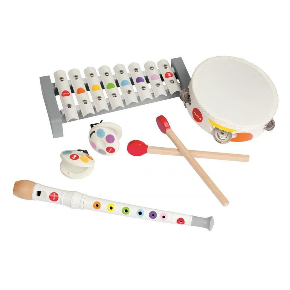 Nádherný farebný hudobný set pre malých hudobníkov je potom pre vás to pravé! Hudobný set obsahuje xylofón, tamburínu, flautu a kastanety. Nástroje podporujú rozvoj hudobného cítenia a zmyslu pre rytmus vašich ratolestí, a vďaka ich rôznorodosti celej vašej rodinke určite ponúknu hodiny plné zábavy. Vhodné pre deti od 2 do 5 rokov.