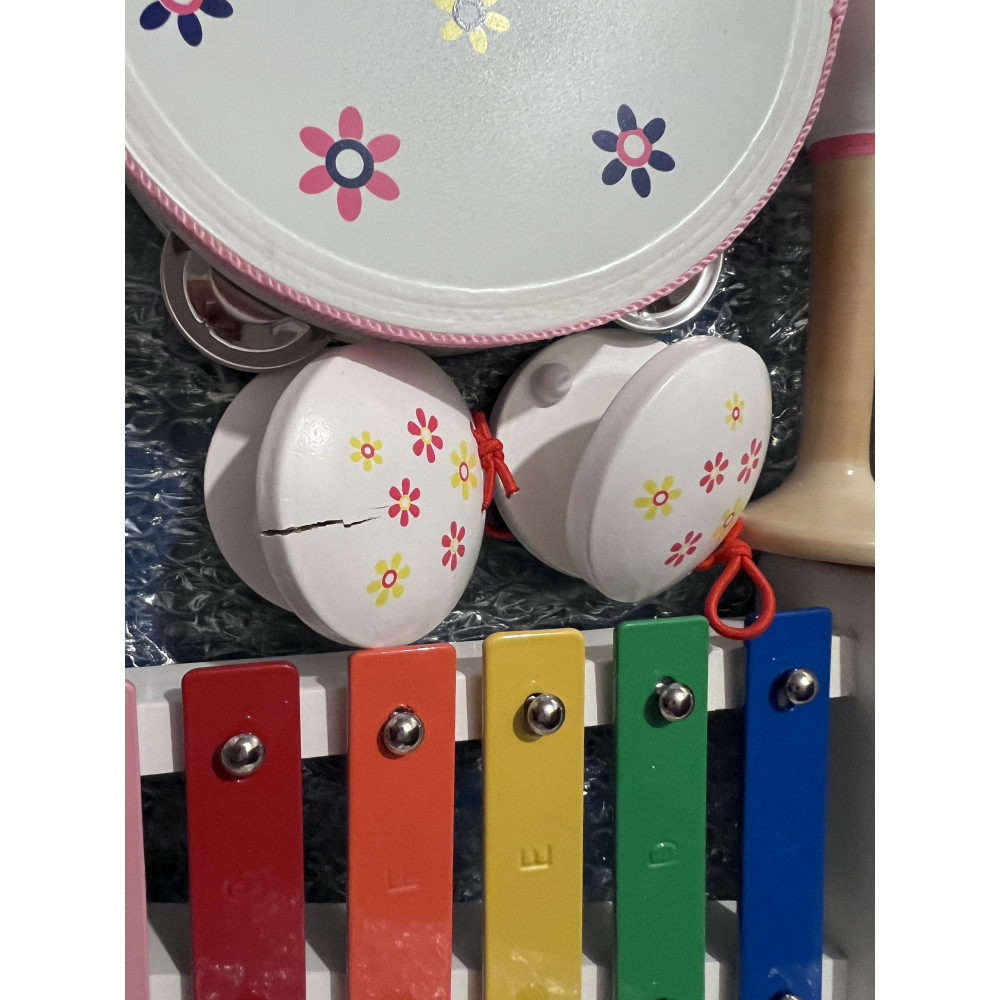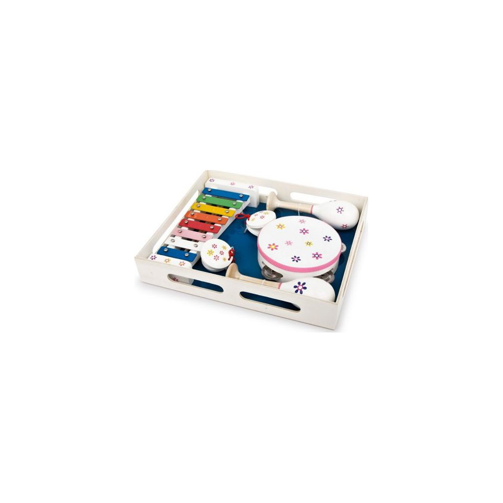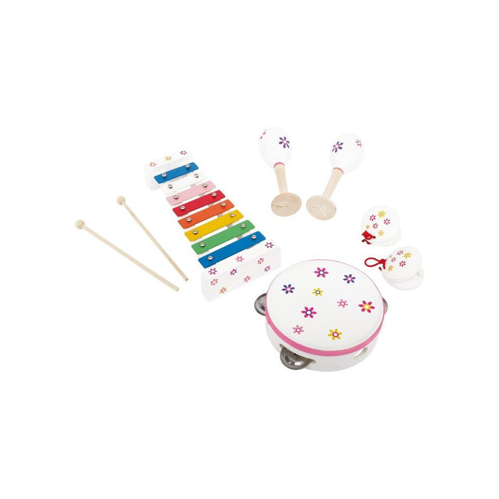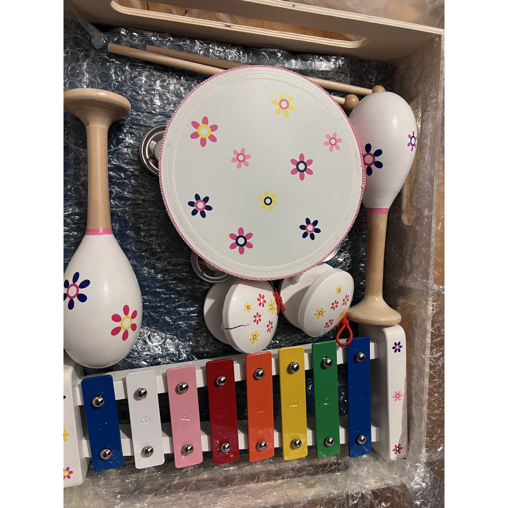 4 různé instrumenty jsou nalakovány bílou barvou a květinové motivy jsou pestrobarevné. Zahrajte melodie na 8 tónech xylofonu a doprovázejte takt s rytmickými instrumenty – zde je hudební zábava v rukou dětí! Praktické uložení v obsažené dřevěné krabici.