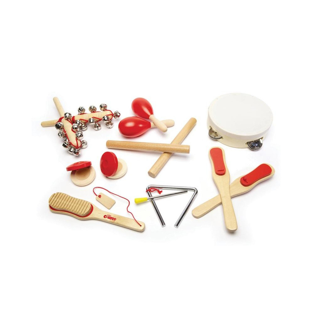 Mladí nadšení muzikanti mohou bubnovat, cinkat, a chrastit, co jim hrdlo ráčí a to díky tomuto krásnému 14 dílnému setu bicích nástrojů. Tamburína, kastaněty, rumba koule, rolničky, paličky, guiro a triangl, to stačí k vytvoření kapely! Výborné pro kreativní skupinovou hru a brzké představení bicích nástrojů. Nástroje jsou vyrobeny ze dřeva, mají červené detaily a velikostně jsou tak akorát pro dětské ruce. Rozvíjí smysl pro rytmus a časování. Vyrobeno z kvalitních materiálů z odpovědných zdrojů. Odpovídá evropské bezpečnostní normě.