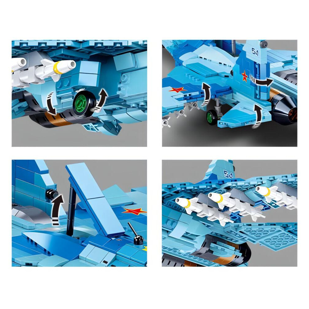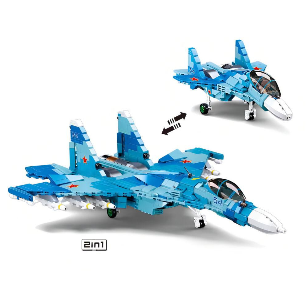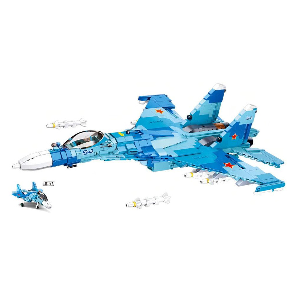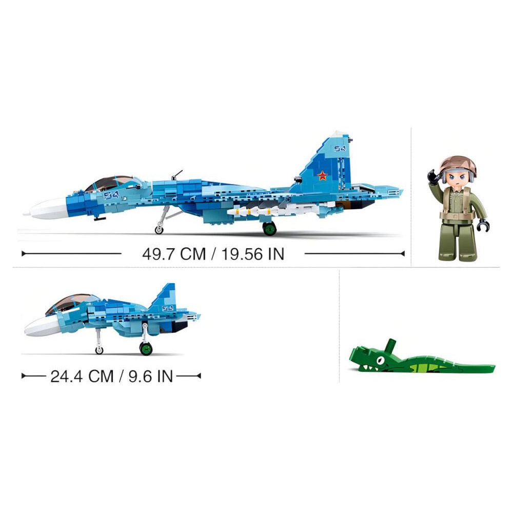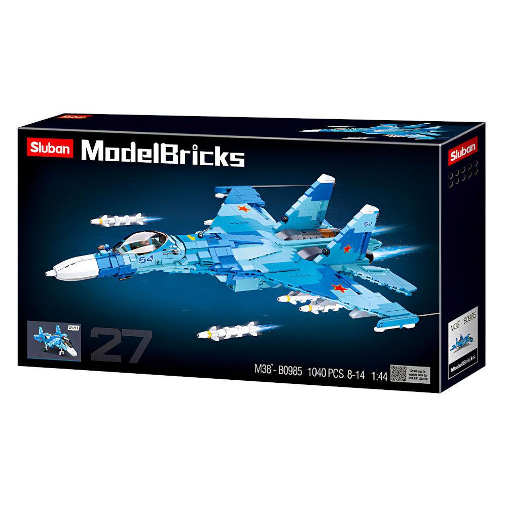 Dva stíhací letouni v modrém provedení o šířkách 49,7 cm a 24,4 cm. Součástí stavebnice je tištěný návod. Inovativní stavebnice Sluban je možno kombinovat s podobnými stavebnicemi mnoha dalších významných výrobců. Jsou vyráběny z kvalitního, nezávadného a odolného ABS plastu. Každá stavebnice je opatřena návodem k sestavení a balena v pestře potištěné papírové krabičce.