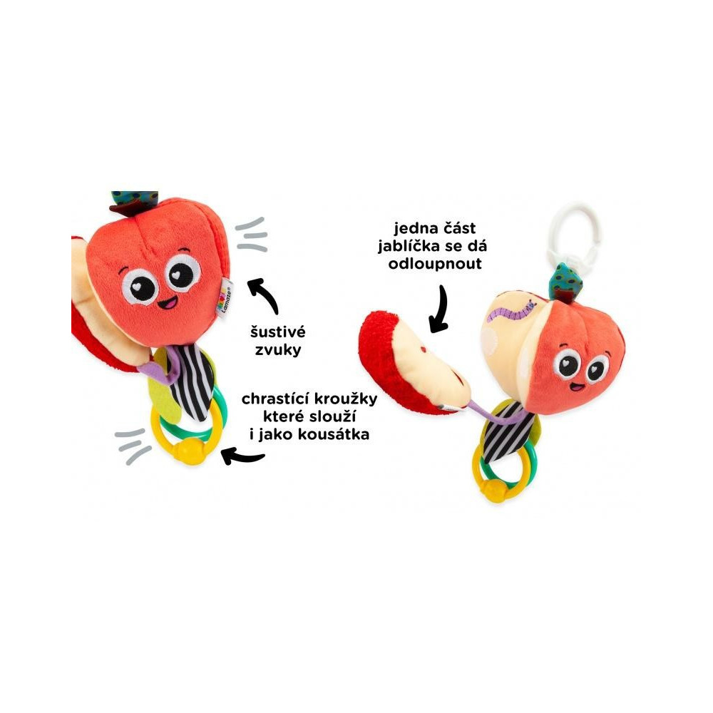 Moje první jablíčko je vyrobeno z různě strukturovaných a barevných materiálů, které stimulují zrak, hmat a rozvíjí motoriku. Jablíčko při doteku šustí, kontrastní černobílé vzory na spodních lístcích pomáhají správnému rozvoji zraku v první vývojové fázi dítěte, charakteristický tvar očí upoutává dětskou pozornost a podporuje rozvoj koncentrace. Jedna třetinka jablíčka se dá odebrat a opět vrátit zpět. Hračky Lamaze jsou navrhovány odborníky na dětský rozvoj tak, aby byly přínosem v každé etapě jeho vývoje. Díky závěsnému klipu hračku snadno zavěsíte na kočárek, postýlku, autosedačku nebo nákupní vozík.