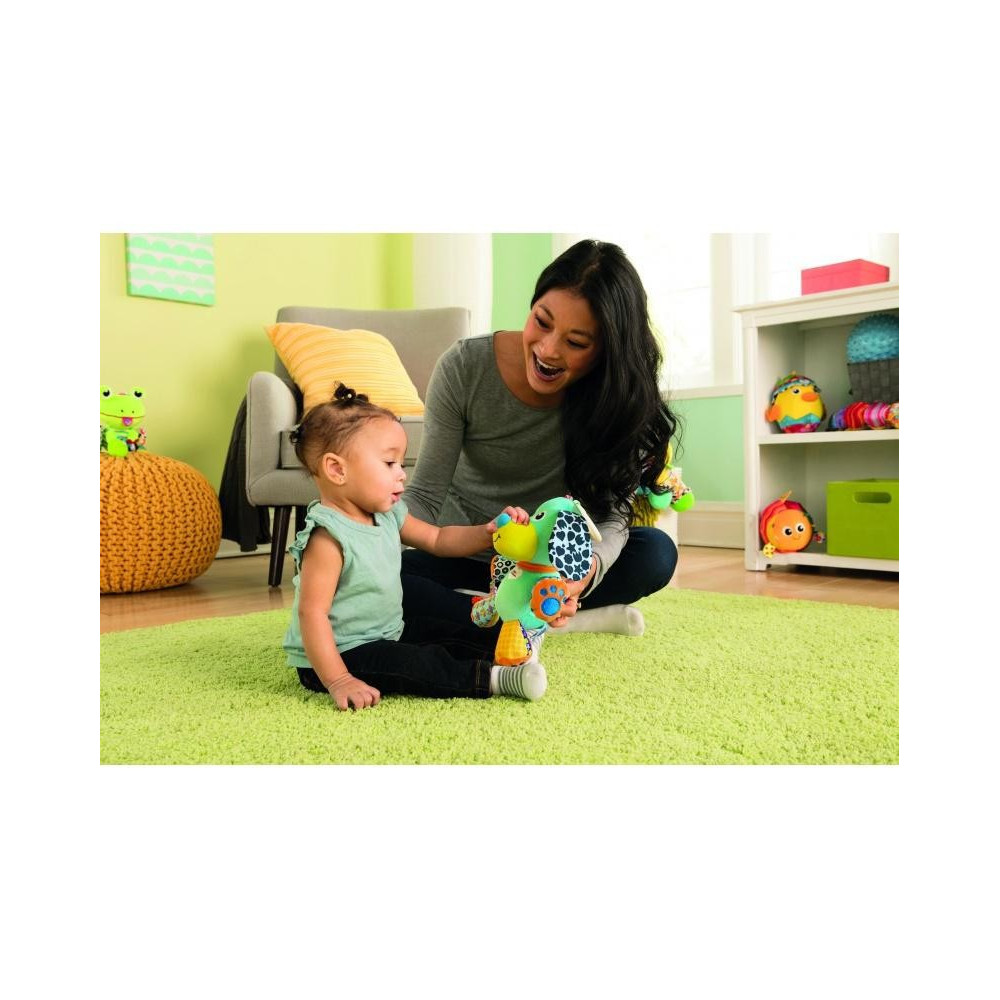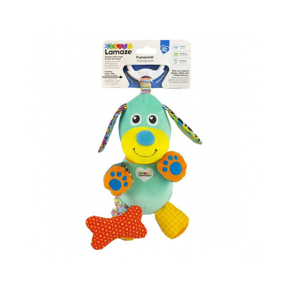 Toto štěkající štěně je vyrobeno z mnoha různých materiálů, které stimulují hmatové receptory. Pestré barvy a černobílé kontrastní vzory pak napomáhají rozvíjení zraku. Po zmáčknutí čumáku začne štěně štěkat a funět. Elektronický zvukový systém umožňuje až několik set přehrání. Vaše dítě si také oblíbí celou řadu šustivých a cinkavých zvuků - uši šustí, bříško píská, některé nohy cinkají, jiné mají v sobě ukryty různé tvary pro stimulaci hmatu. Když se s pejskem zatřese, začne chrastit. Díky závěsnému klipu v horní části hračku snadno zavěsíte na kočárek, postýlku, autosedačku nebo nákupní vozík.