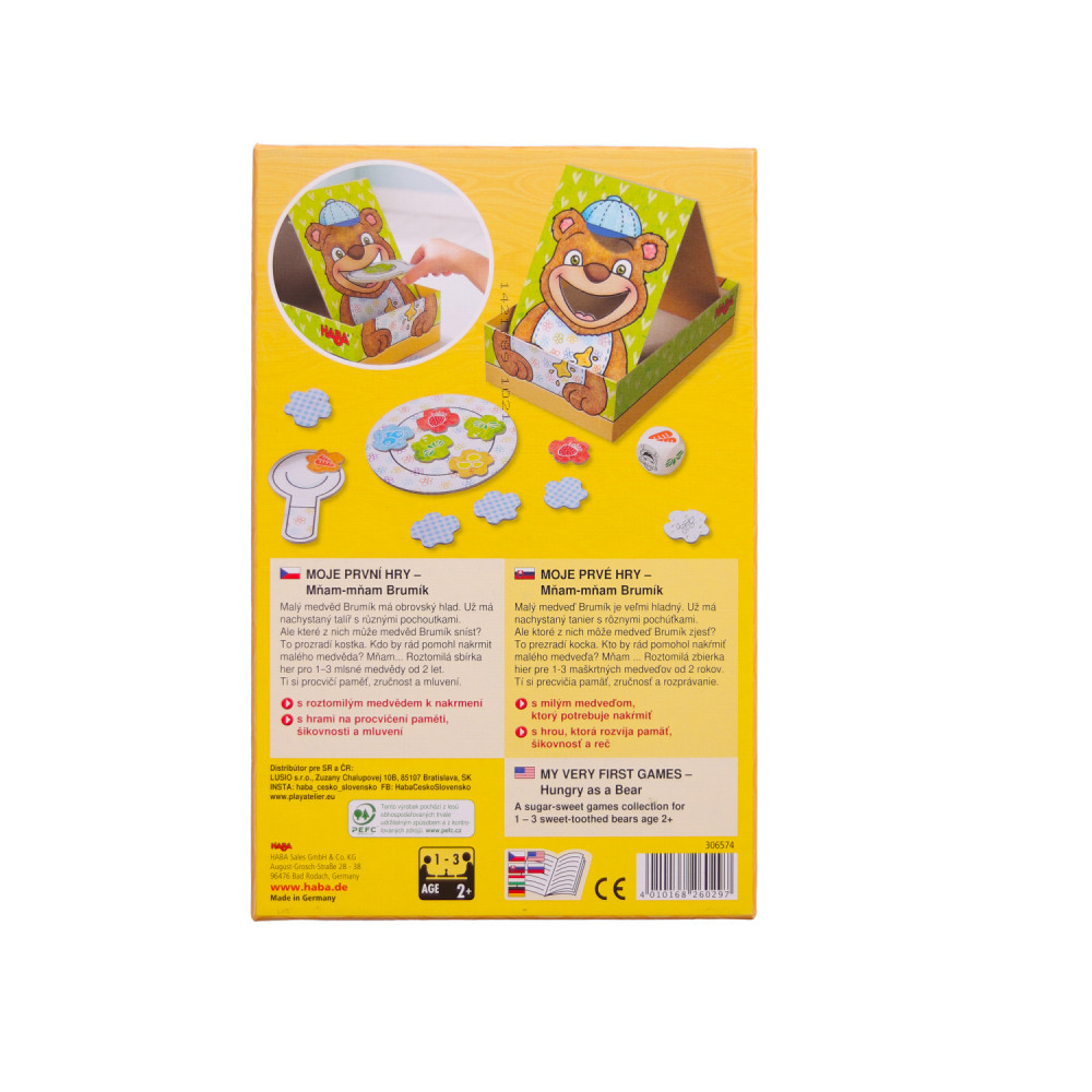 Hra Mňam-mňam Brumík pre deti od 2 rokov posilňuje pamäť, šikovnosť a jazykové schopnosti, je určená pre 1 až 3 hráčov.Malý medvedík je hladný! Potrebuje vašu pomoc pri jedení ovocia a zeleniny! Pripravte si porcie jedla na tanierik, hoďte kockou a pomocou lyžice nakŕmte medvedíka podľa toho, aké jedlo sa zobrazí na kocke. Kto z Vás nakŕmi malého medvedíka? Táto hra posilňuje pamäť, šikovnosť a jazykové schopnosti vášho dieťatka. Je skvelá pre 1 až 3 hráčov. Vhodné pre deti: od 2 rokov