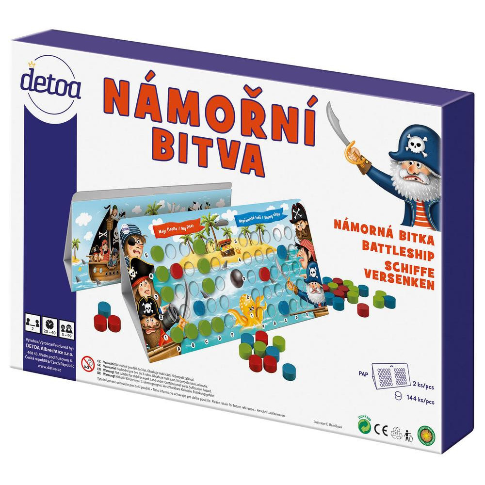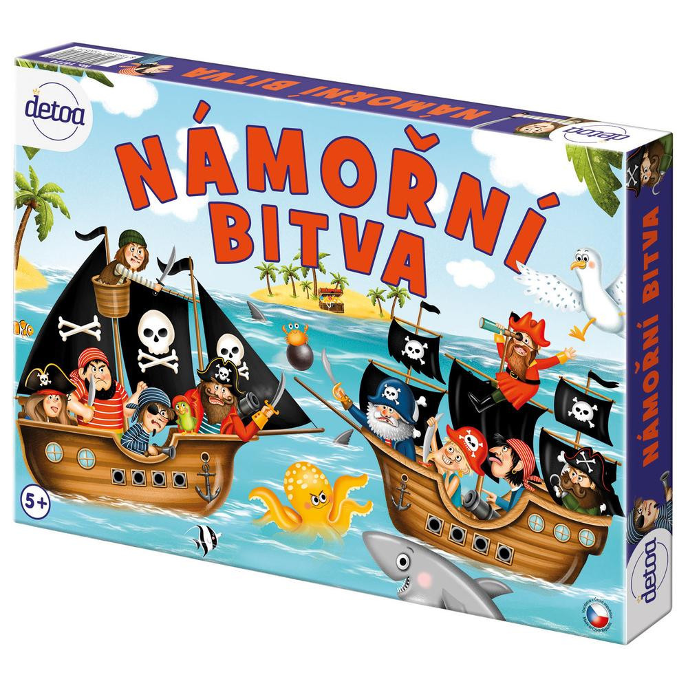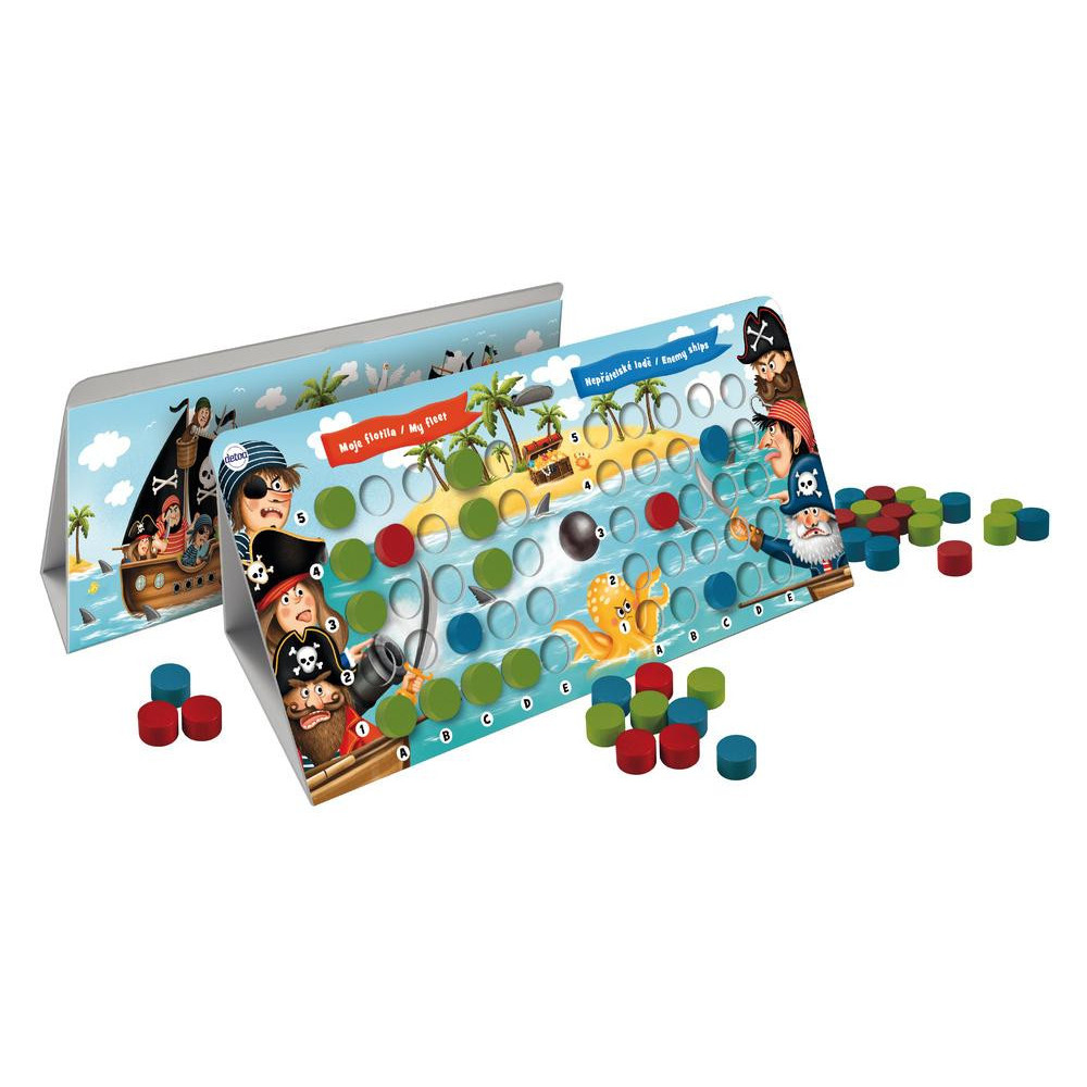 Originální rodinná hra pro děti i dospělé. Tato námořní bitva je epickou strategickou hrou pro dva až 6 hráčů, která přináší dobrodružství a taktiku na Váš stůl. V této pirátské námořní bitvě je vaším úkolem zničit nepřátelskou flotilu dříve, než jsou všechny Vaše lodě potopeny. V roli kapitána musíte připravit svoji bitevní strategii a dovést své námořníky k vítězství! Nasaďte flotilu, naplánujte svůj útok a bitva může začít. Tahle hra je nejen vizuálně poutavá, ale také nabízí skvělý herní zážitek. Výrobek splňuje požadavky EU na bezpečnost hraček a je vhodný pro děti od 5 let.