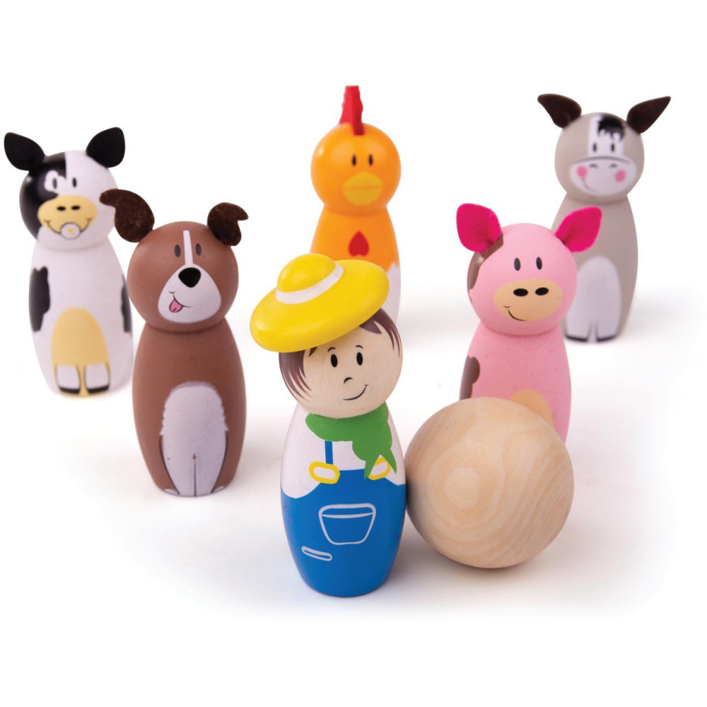 7dílná hrací sada kuželek obsahuje 6 dřevěných postaviček a 1 dřevěnou bowlingovou kouli.