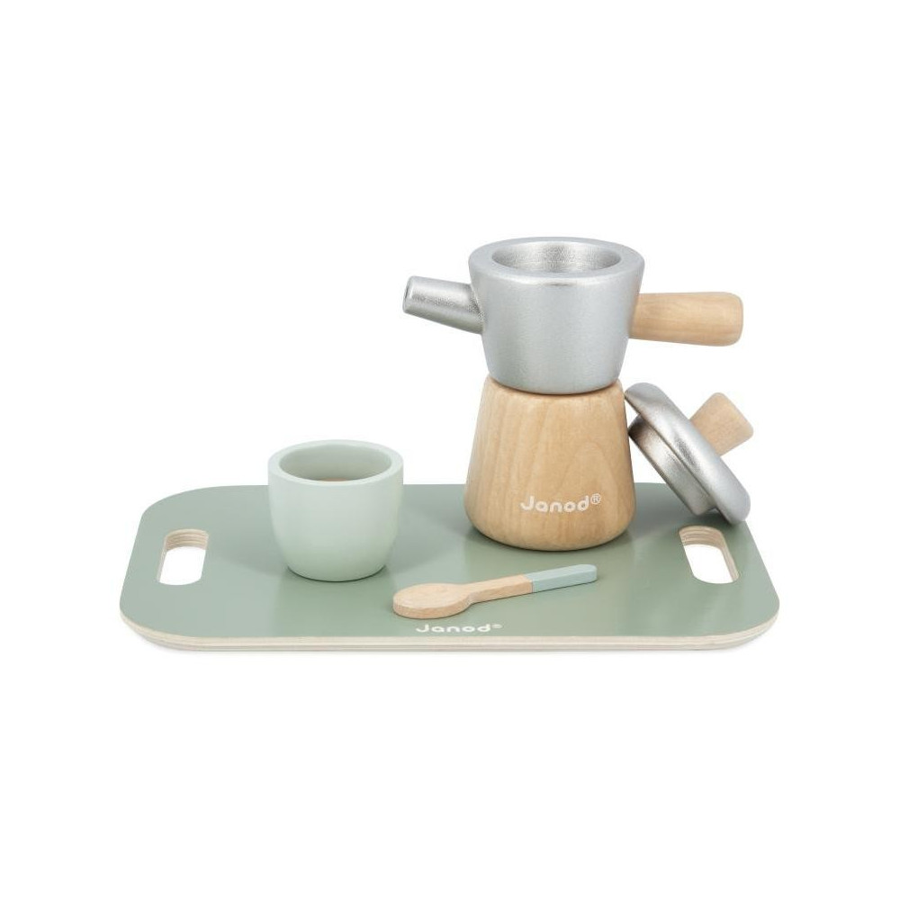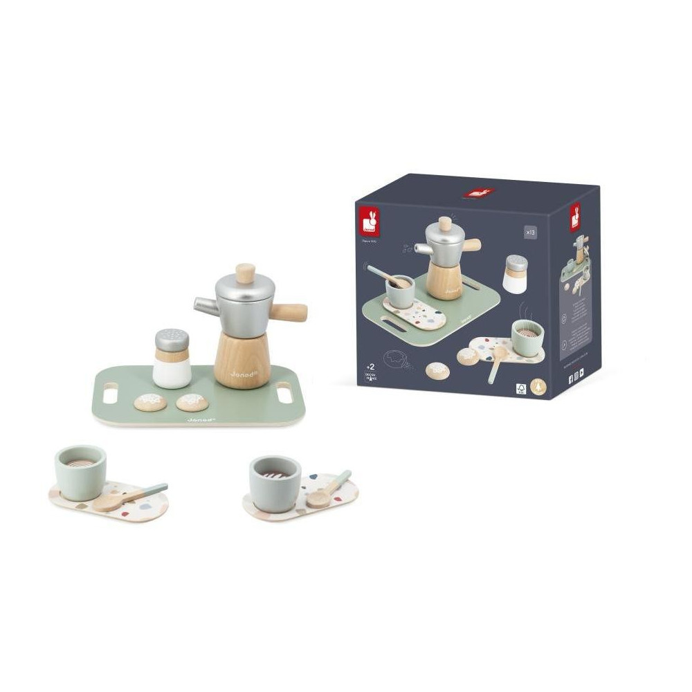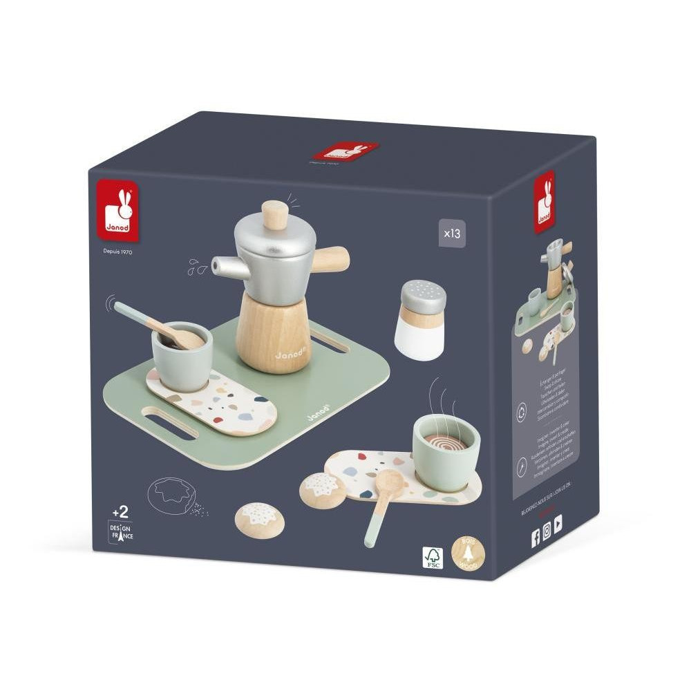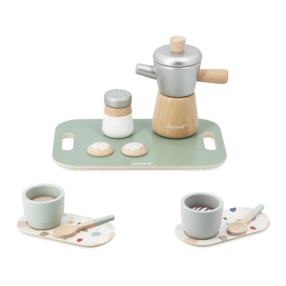 Je čas na kávu! Pozvite svojich hostí na lahodnú kávu pripravenú v kávovare v talianskom štýle. Pretože je dôležité robiť to ako dospelí, táto súprava obsahuje kávovar, 2 šálky, 2 lyžice, 2 podšálky a cukorničku. Čierna káva alebo cappuccino? K dispozícii sú 2 druhy kávy, aby vaše dieťa uspokojilo svojich hostí. Pre tých, ktorí majú chuť na sladké, môžu horúci nápoj doplniť o dve sušienky. Keď je čas servírovať, vaše dieťa môže všetko predložiť na krásnom drevenom podnose s dvoma rúčkami. Praktické pre služby hodné tých najväčších talianskych kaviarní! Táto imitácia hračky s moderným dizajnom je ideálna na rozvíjanie fantázie vášho dieťaťa. Hračka vyrobená z dreva s certifikátom FSCTM. Imitácia hračky pre deti od 2 rokov.