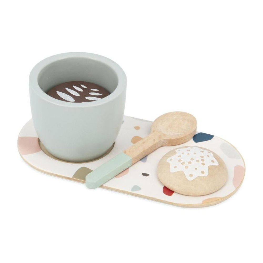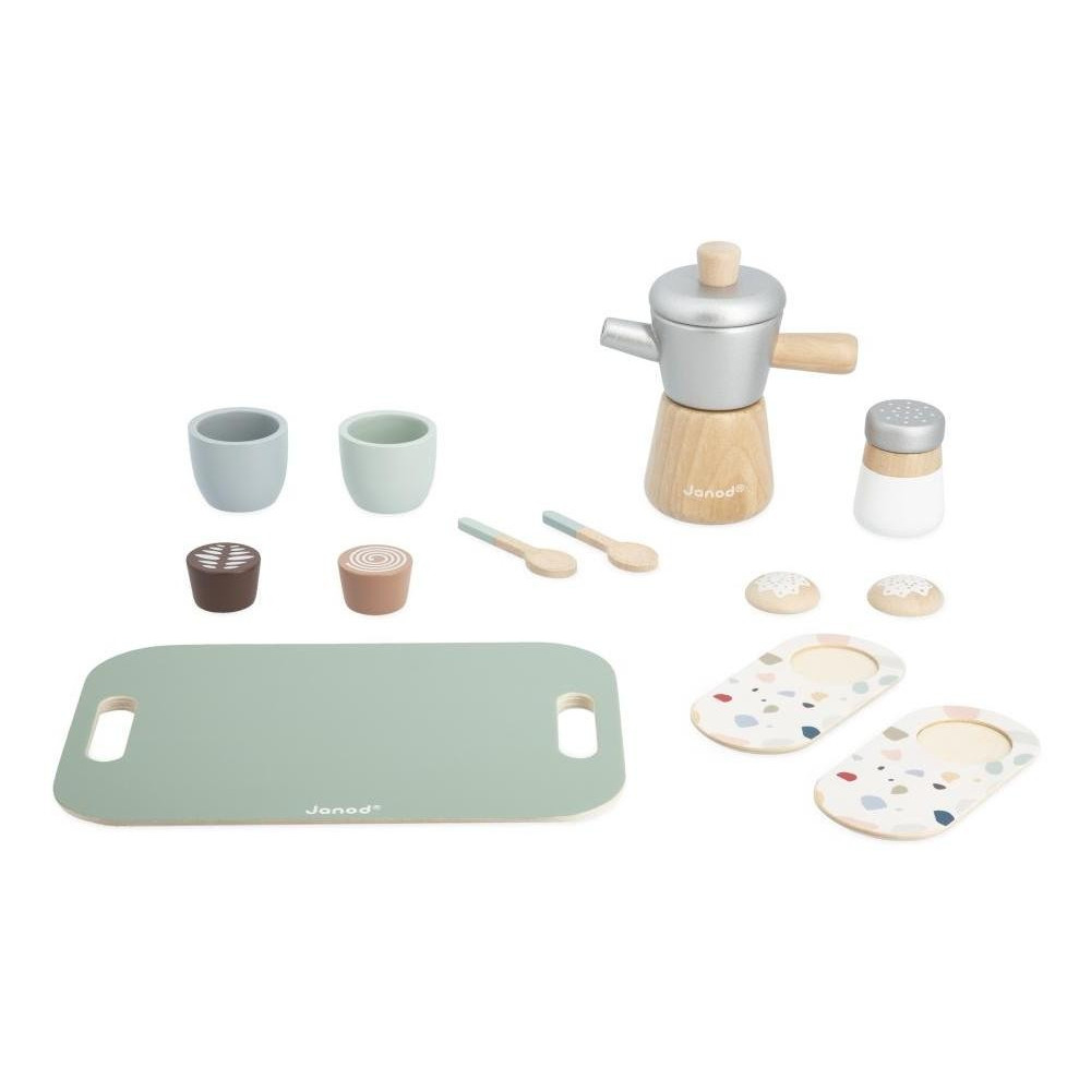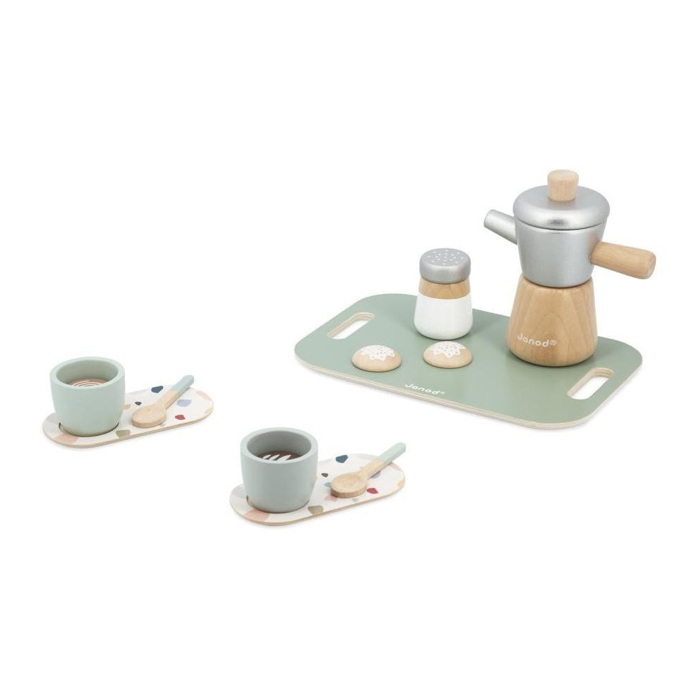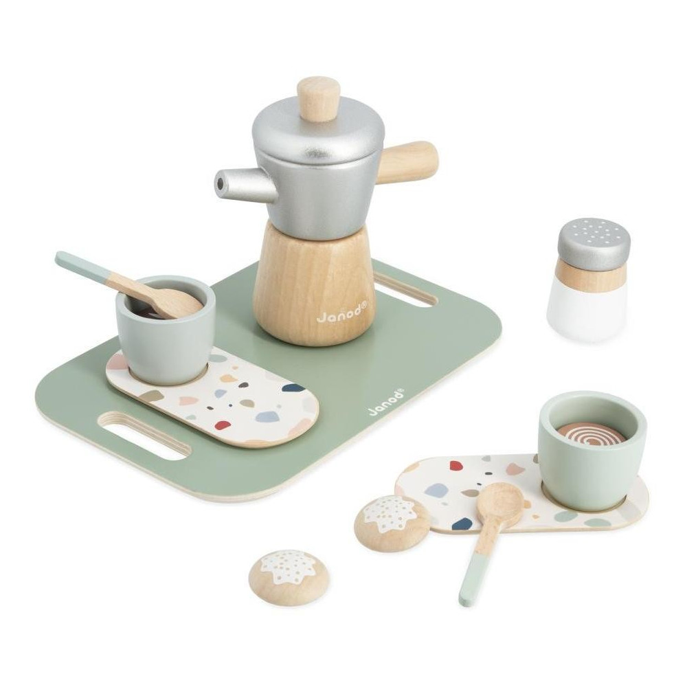 Je čas na kávu! Pozvite svojich hostí na lahodnú kávu pripravenú v kávovare v talianskom štýle. Pretože je dôležité robiť to ako dospelí, táto súprava obsahuje kávovar, 2 šálky, 2 lyžice, 2 podšálky a cukorničku. Čierna káva alebo cappuccino? K dispozícii sú 2 druhy kávy, aby vaše dieťa uspokojilo svojich hostí. Pre tých, ktorí majú chuť na sladké, môžu horúci nápoj doplniť o dve sušienky. Keď je čas servírovať, vaše dieťa môže všetko predložiť na krásnom drevenom podnose s dvoma rúčkami. Praktické pre služby hodné tých najväčších talianskych kaviarní! Táto imitácia hračky s moderným dizajnom je ideálna na rozvíjanie fantázie vášho dieťaťa. Hračka vyrobená z dreva s certifikátom FSCTM. Imitácia hračky pre deti od 2 rokov.