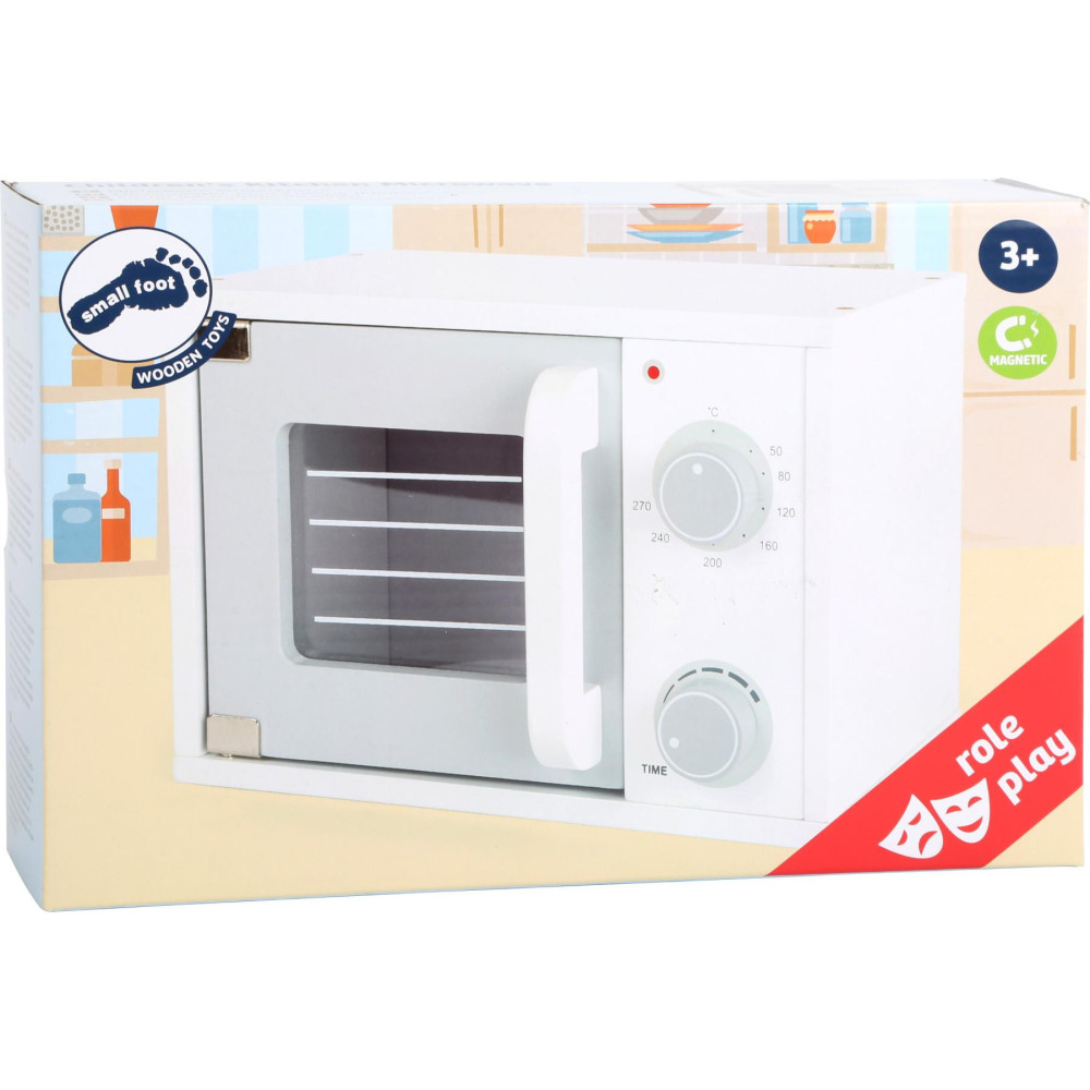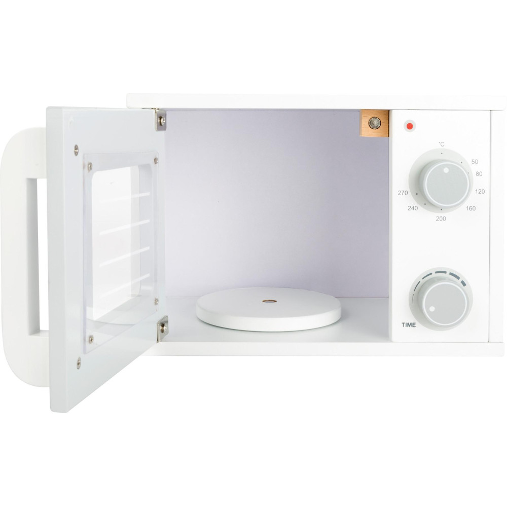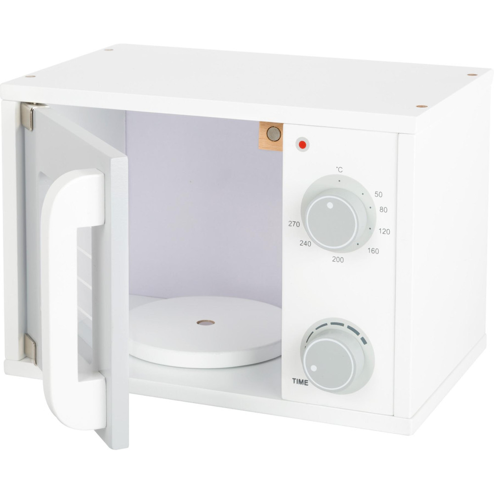 Cink ... a jídlo je připravené! S touto dřevěnou mikrovlnnou troubou mohou děti předstírat, že si ohřejí a připraví pokrm jako ve skutečném světě. Tento realistický domácí spotřebič má otočný talíř a dvířka s magnetickým zavíráním. Pomocí otočných knoflíků lze snadno nastavit funkce teploty a času. Praktický domácí spotřebič, který patří do každé moderní dětské hry. Ideální doplněk všech dětských kuchyněk.