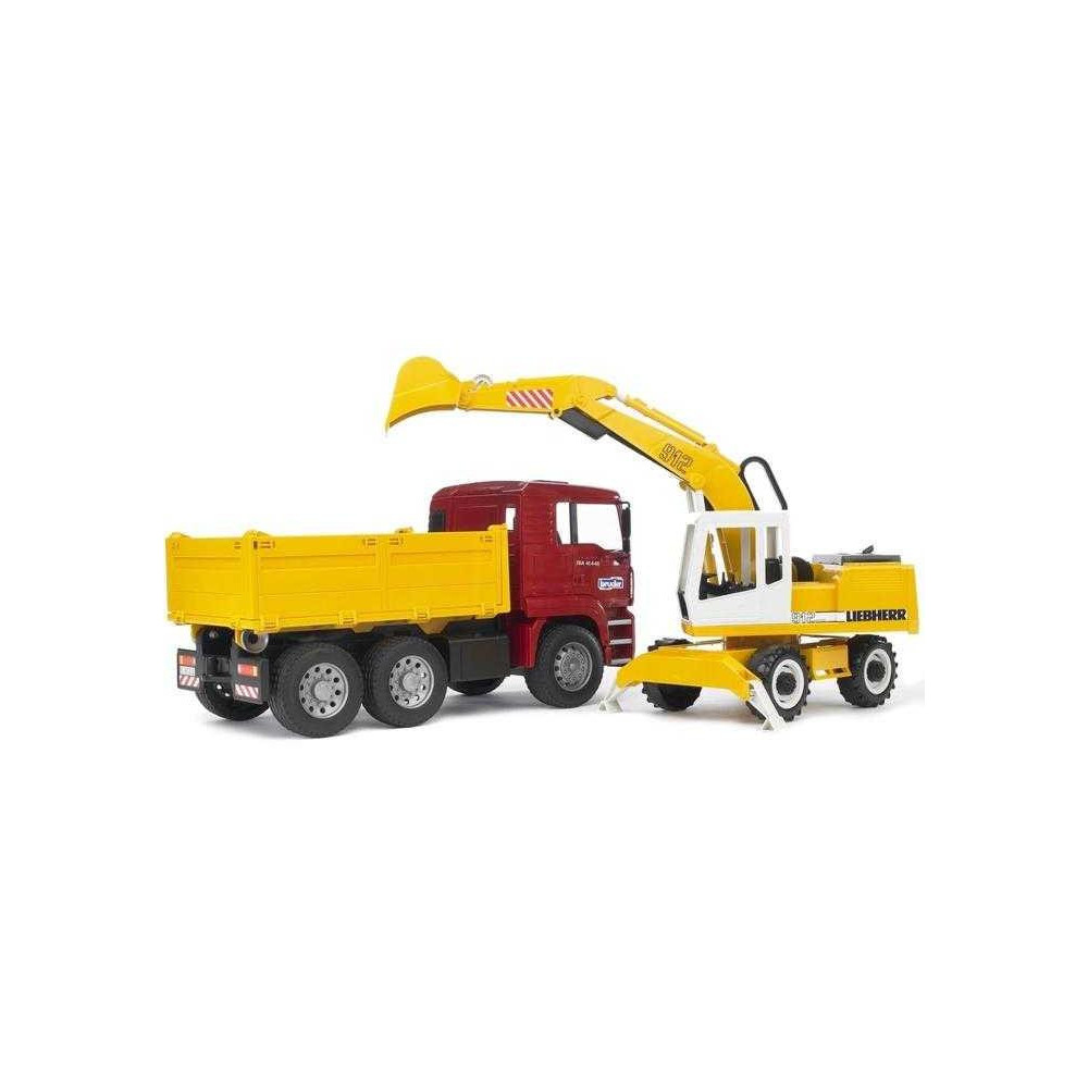 Nákladní auto MAN TGA je klasický sklápěč s měkkými pneumatikami a sklopnou korbou. Součástí setu je bagr Liebherr na nakládání materiálu. Bagr má stabilizační výsuvné opěrné nohy, profilové pneumatiky a funkční rýpadlo s otočnou kabinou. Kabina s plně funkčním ramenem se lžící se otáčejí o 360°. Doporučujeme k vozu dokoupit a nainstalovat světelný a zvukový maják BR2801. Vyrobeno v Německu, z kvalitních materiálů.