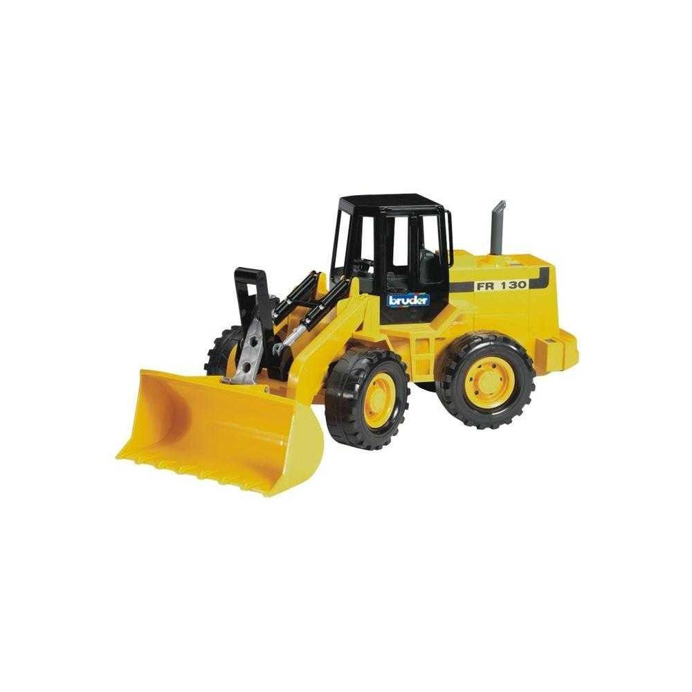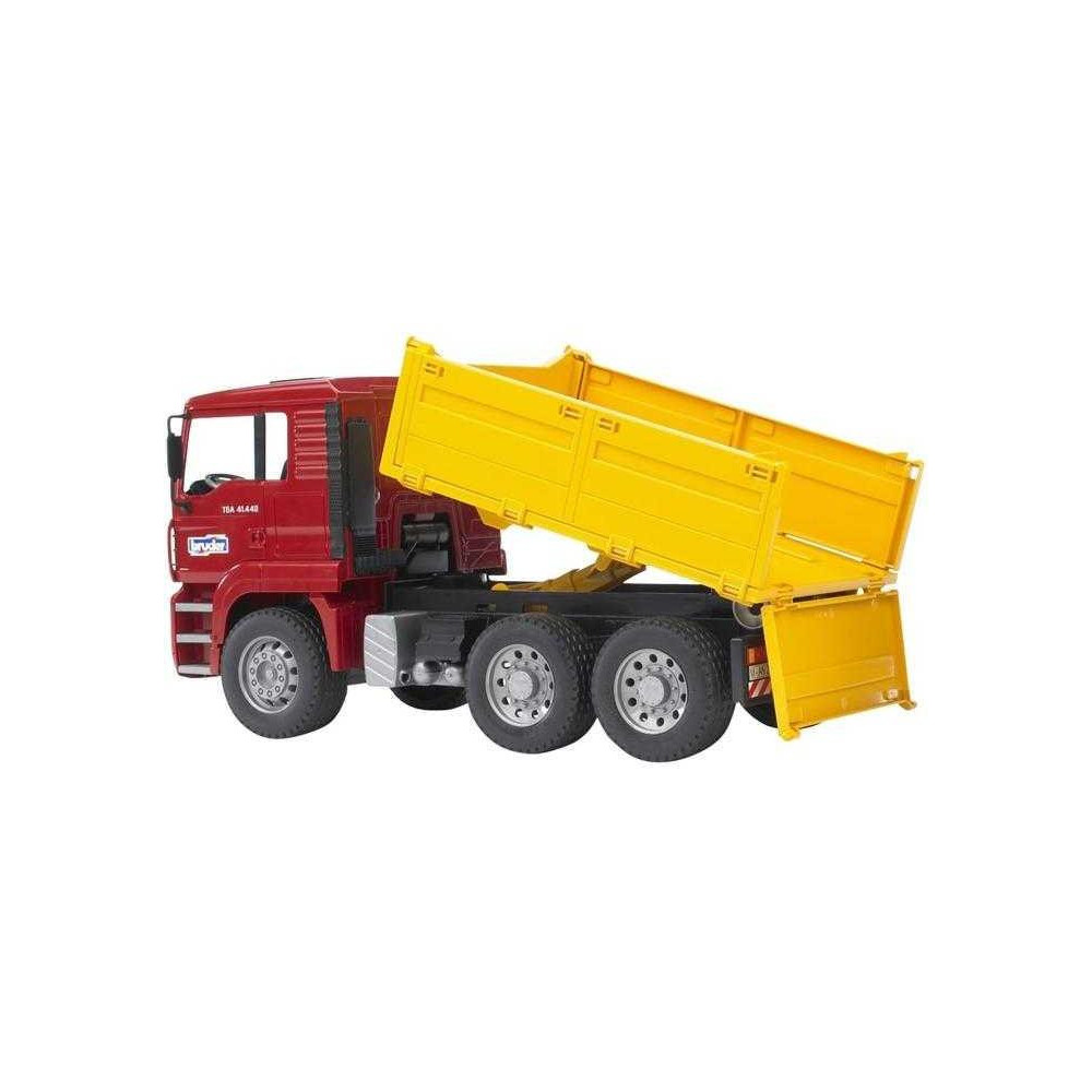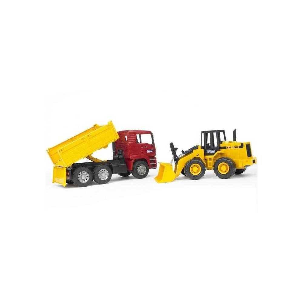 Bruder 02752 MAN sklápěč a čelní nakladač FR130 to je nákladní auto s červenou kabinou a žlutou sklápěčkou a žlutý nakladač s černou kabinou. Kabina auta je odklápěcí a sklápečka na autě plně funkční. I sklápěcí bočnice jsou funkční jako na skutečném vozidle. Čelní nakladač FR130 má pohyblivý kloub a zvedací a vyklápěcí lžíci. Vyrobeno v Německu, z kvalitních materiálů.