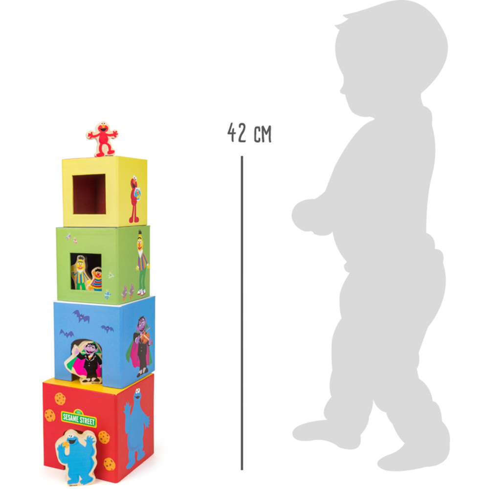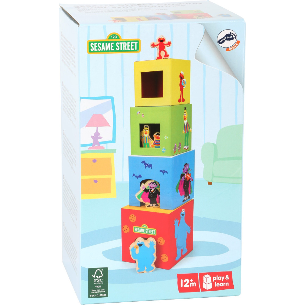 U této hry jsou Cookie Monster, hrabě, Ernie, Bert a Elmo vyobrazeni na jednotlivých kostkách, které musí být naskládány ve správném pořadí. Zářezy v každé kostce nabízejí dostatek místa pro figurky vyrobené ze 100% certifikovaného dřeva FSC®. Děti hrou procvičují čísla 1-4, motorické dovednosti a poznávání barev.