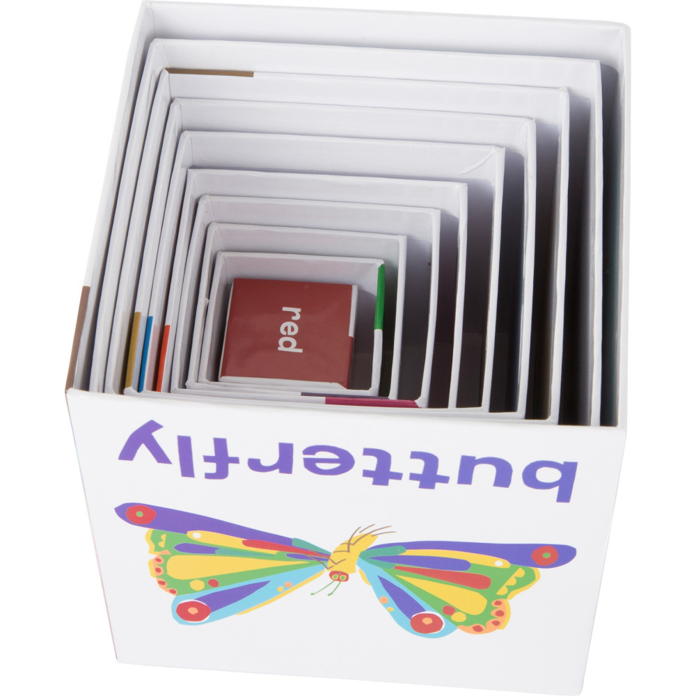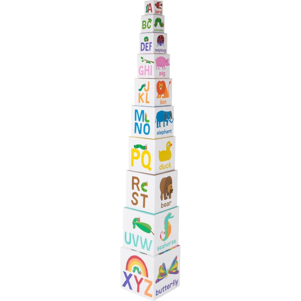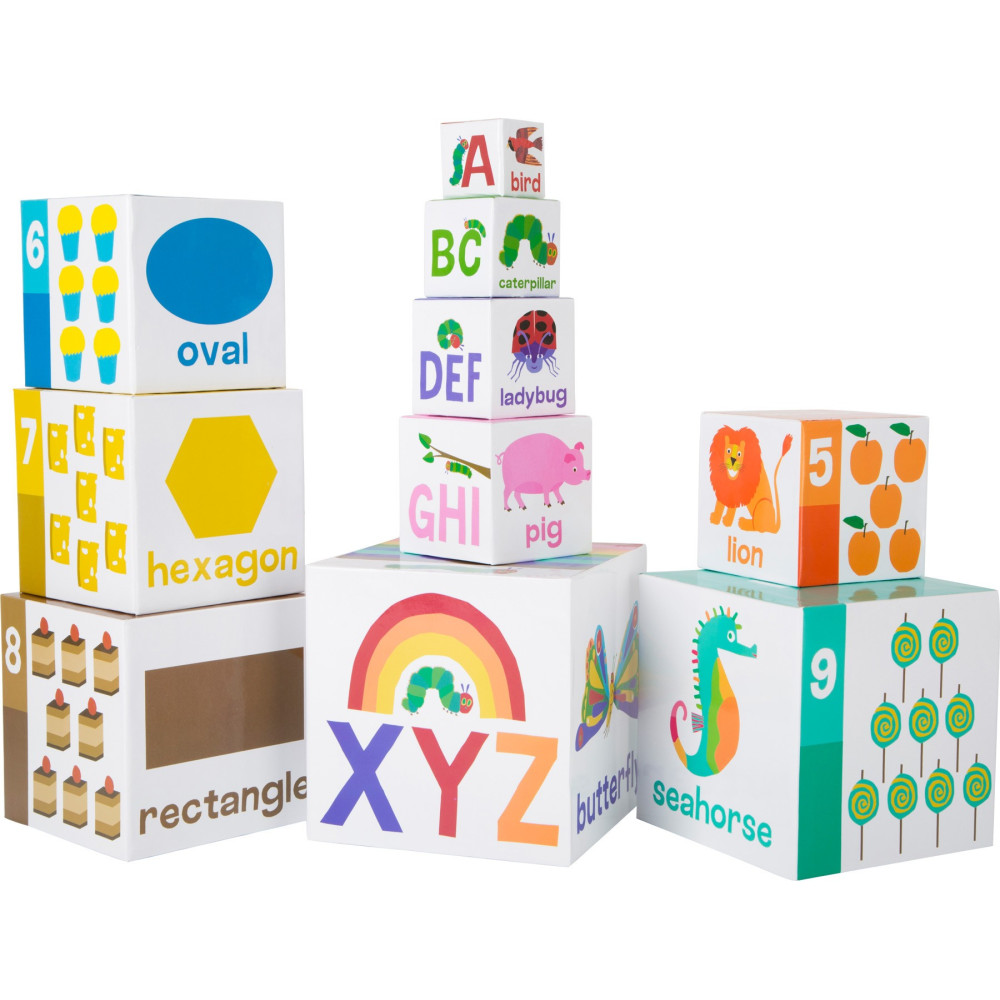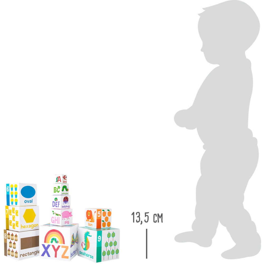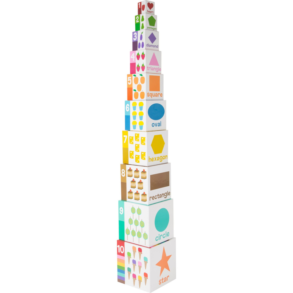 Deset stohovacích kostek vyrobených ze stabilní lehké lepenky je potištěno zvířaty, písmeny a čísly. Při stohování děti trénují znalost čísel, písmen a své jemné motorické dovednosti a soustředění, aby se věž okamžitě nerozpadla. Všechny kostky lze snadno naskládat do sebe a uložit, aby se ušetřil prostor.