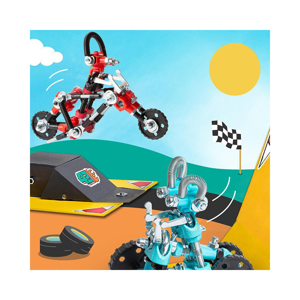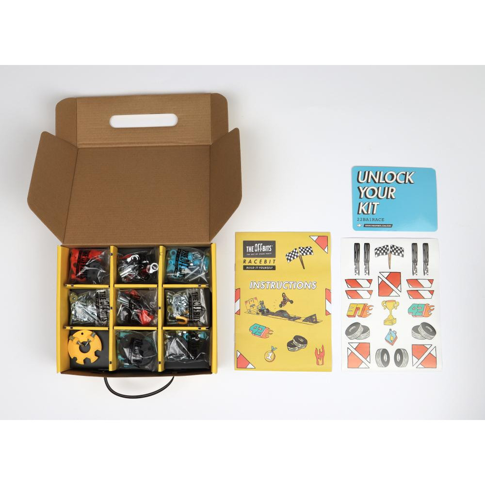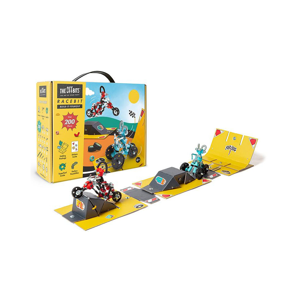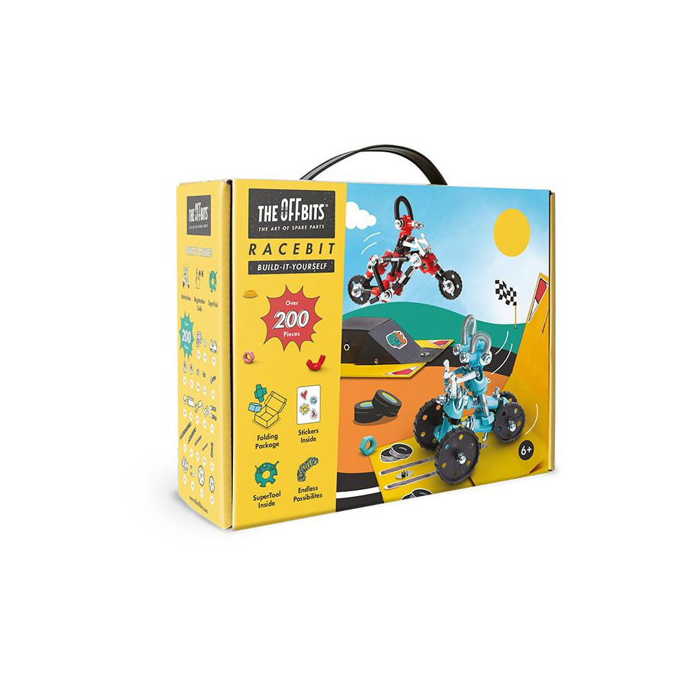 Je čas zařadit rychlost a odstartovat závod. Přeměňte kartonovou krabici OffBits na závodní dráhu s rampou a sestavte závodní týmy z matic a šroubů. Sestav CharlieBit a jeho červenou motorku CrossBit a pak JumperBit s jeho parádním modrým ScooterBitem. Nechte je mezi sebou závodit a vyzkoušejte, jak vysoko dokáží přeskočit rampu nebo kdo udělá nejhustší triky. Sada obsahuje více než 200 barevných matic, šroubů, tvarovaných kousků, samolepek a naše víceúčelové balení s nulovým odpadem, které se promění v součást herního zážitku a stane se závodní dráhou. Popusťte uzdu své fantazii. Tato sada umožňuje vytvoření čtyř modelů s dalšími nekonečnými možnostmi pro vaše vlastní kreativní nápady. Jedná se o hračku, která pomáhá mladým lidem růst v oblastech vědy, technologie, inženýrství, umění a matematiky. Hračky OffBits také podporují rozvoj jemné motoriky, prostorové představivosti, řešení problémů a nápadité hry. Co můžete postavit:CharlieBit a jeho červenou motorku CrossBit, JumperBit s jeho parádním modrým ScooterBitem plus nekonečné množství jedinečných výtvorů, které můžete postavit pomocí své fantazie. Máte kolem sebe karton, šroubky nebo jiné zábavné materiály? Vylepšujte s předměty každodenní potřeby a vytvořte také své vlastní jedinečné vynálezy. Hlavní vlastnosti: obsahuje nářadí pro sestavení stavebnicekompatibilnost s každodenními předmětyrozvoj kreativity, jemné motoriky i logického myšlenívhodné od šesti letvíce než 200 dílůobal je součástí herního zážitku