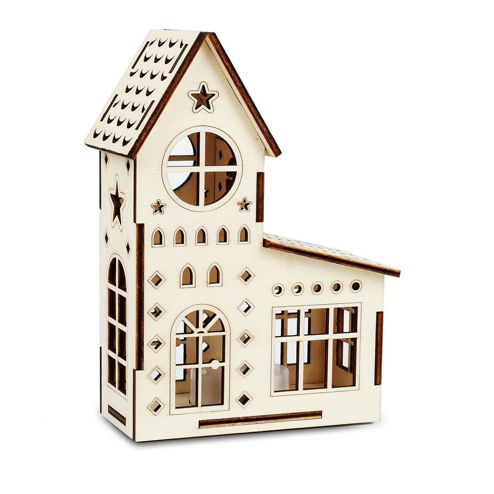 3D miniatura velkého domečku. Kostel představující symbol víry a naděje, pokoje a lásky k Bohu. I vám může tento kostelík zpříjemnit chladné večery svým jemně blikajícím světlem LED svíčky. Tato dřevěná dekorace slouží jen na postavení na poličku nebo stůl bez možnosti zavěšení z důvodu mohutnosti a váhy konstrukce domečku. Dodává se už postavený, tak jak ho vidíte na obrázku. Součástí je i LED svíčka, ve které je vyměnitelná 3V baterie.