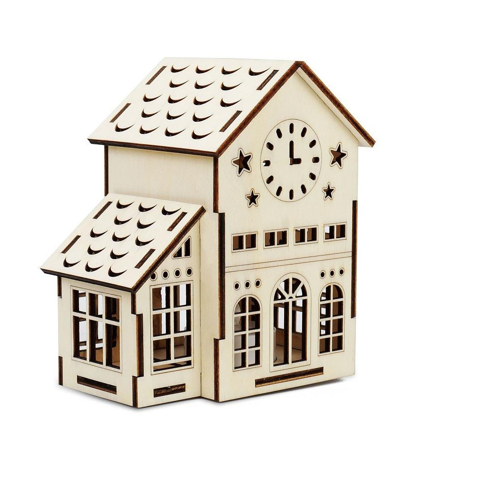 3D miniatura většího domečku s hodinami na věži. Hodiny na vrcholku věže jsou často dominantou náměstí na Slovensku. Hodinová věž v současnosti chrání dědictví slovenské historie a tím je jedinečná. Tento větší domeček se dodává už postavený, tak jak ho vidíte na obrázku. Součástí je i LED svíčka, ve které je vyměnitelná 3V baterie.