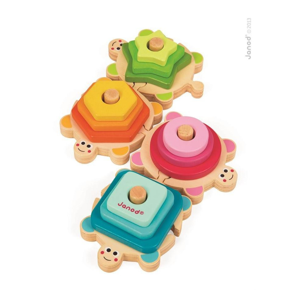 Nechajte sa uniesť farebným svetom farieb a tvarov, ktoré vám ponúkajú tieto 4 korytnačky! Nádherné farebné drevené vkladacie puzzle v tvare korytnačky sú skvelou pomôckou na rozvoj jemnej motoriky vašich ratolesti. Zároveň sa deti učia farbám a základným tvarom, vkladaním farebných drevených kúskov rôzneho tvaru na príslušné vyčnievajúce miesta na chrbte korytnačiek. Korytnačky sa dajú od seba oddeľovať a spájať.Vhodné pre deti od 1 roka.