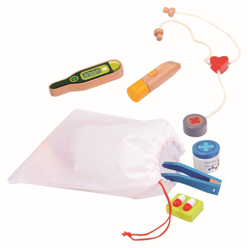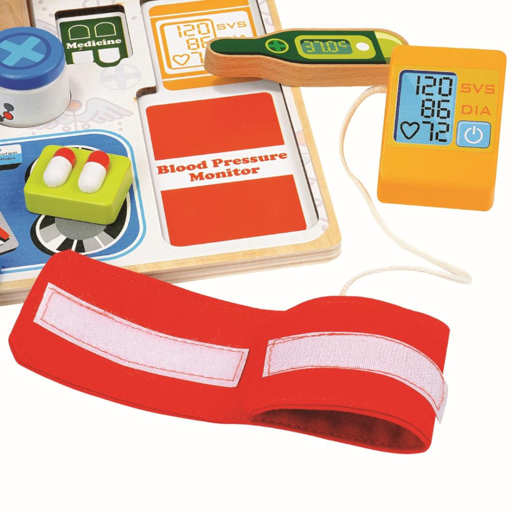 Barevné vkládací dřevěné puzzle. Balení osahuje 14 dílků s pevnou deskou vyrobenou z překližky. Děti se učí rozpoznávat a přiřazovat běžné náčiní z lékařské praxe. Procvičují zde jemnou motoriku, logické myšlení, koordinaci rukou a zraku. Stimuluje se představivost a rozvíjí se dovednosti potřebné k řešení různých situací. Vhodné pro děti od 36 měsíců. Upozornění: Použití dětmi do 3 let pouze pod dohledem dospělé osoby.