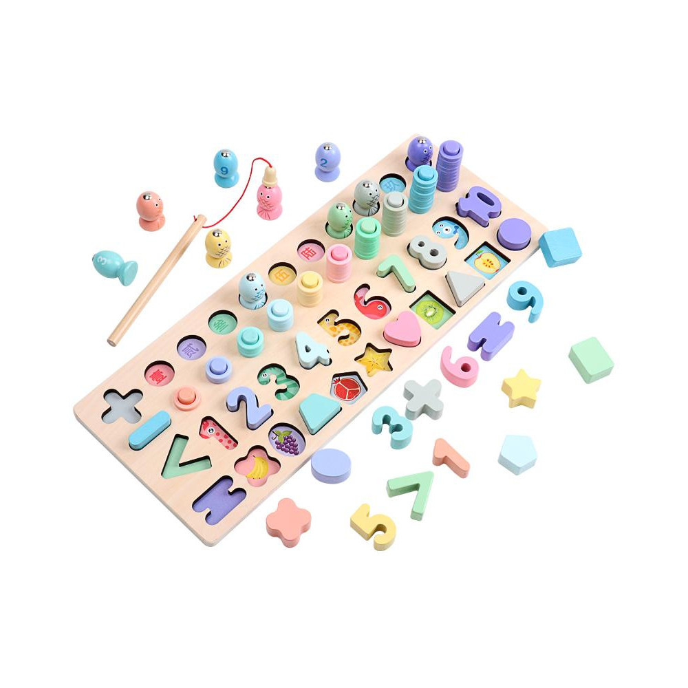 Každý malý šikula si najde to své! Dřevěná multifunkční deska nabízí edukativní hru a pomáhá dětem v koordinaci motoriky, zlepšování koncentrace a rozvoji logického myšlení. Jejím cílem je nejen učení přeměnit na zábavu, ale také vyvinout k učení u nejmenších kladný vztah. Vedle rozpoznávání čísel, tvarů a barev lze v této hře "rybařit" či stohovat kroužky na sebe. Všechny části dřevěné skládačky jsou dimenzovány tak, aby byly ideální pro drobné dětské ruce. Hlavní vlastnosti: multifunkční edukativní hraideální pro trénování motoriky a posílení logického myšlenípodporuje kreativitumění učení na zábavuveselý, pastelový design