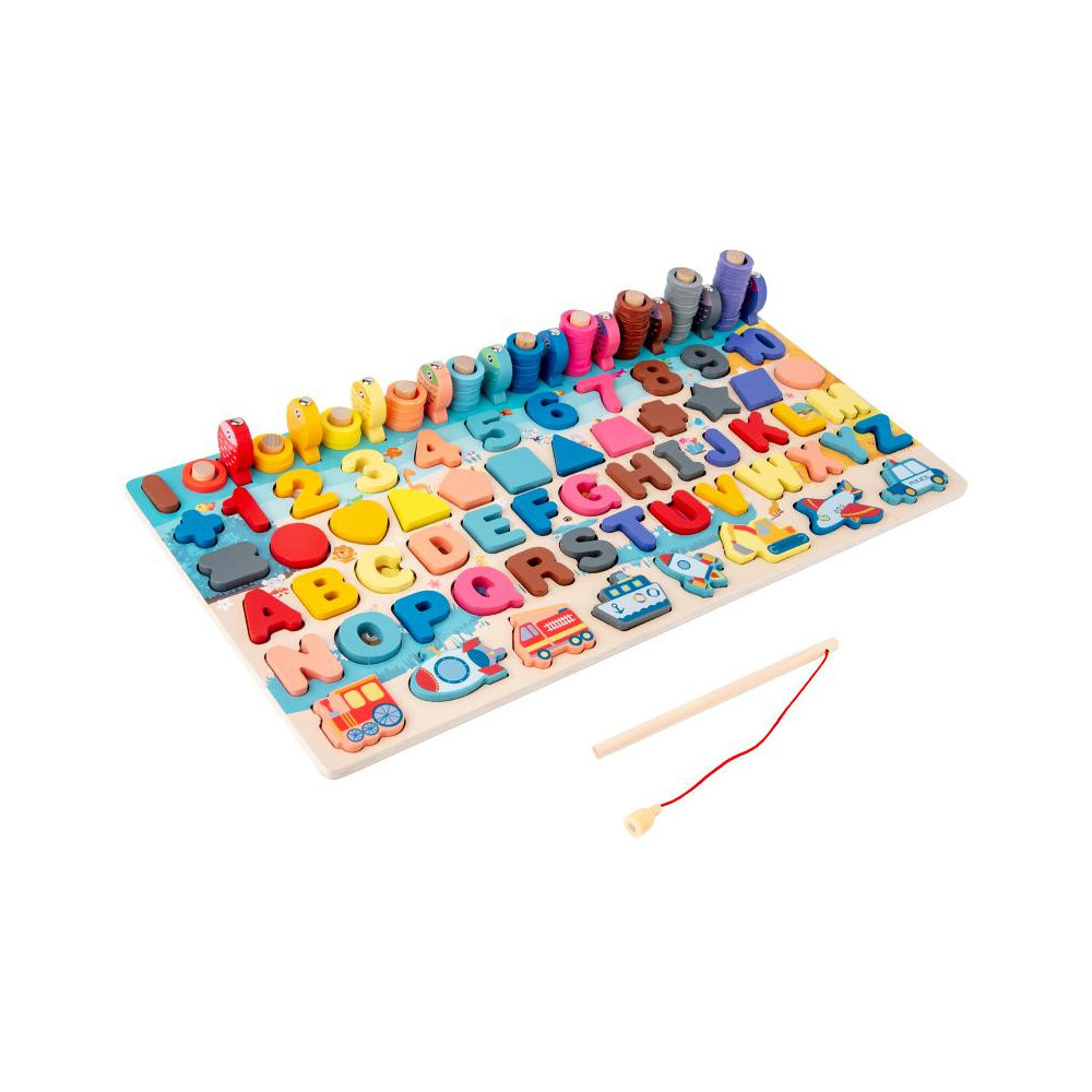 Každý malý šikula si najde to své! Dřevěná multifunkční deska nabízí edukativní hru a pomáhá dětem v koordinaci motoriky, zlepšování koncentrace a rozvoji logického myšlení. Jejím cílem je nejen učení přeměnit na zábavu, ale také vyvinout k učení u nejmenších kladný vztah. Vedle rozpoznávání čísel, tvarů a barev lze v této hře "rybařit" či stohovat kroužky na sebe. Všechny části dřevěné skládačky jsou dimenzovány tak, aby byly ideální pro drobné dětské ruce. Hlavní vlastnosti: multifunkční edukativní hraideální pro trénování motoriky a posílení logického myšlenípodporuje kreativitumění učení na zábavuveselý, pestrý design