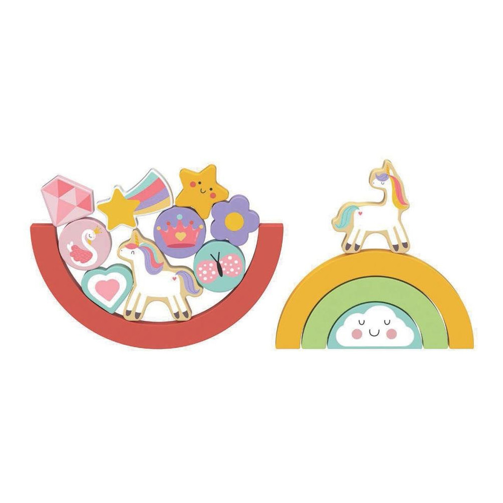 Vítejte v pohádkovém světě Unicorn, kde si jednorožci užívají kouzelnou duhovou pohodu. Tato balanční hra v příjemných pastelových barvách a vkládací puzzle 2 v 1 je nejen zábavná, ale rozvíjí také jemnou motoriku dětí, koordinaci ruka-oko, trpělivost a představivost. Skládá se ze základny a 14 vkládacích dílků. Vkládání dílků je příliš jednoduché? Použijte duhu jako balanční podložku a skládejte jednotlivé dílky na sebe. Podaří se Vám naskládat na duhu všechny dílky, aniž by některý spadl? Hračka je vyrobena z kvalitního FSC dřeva.