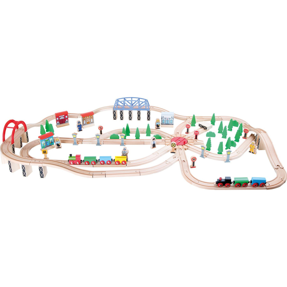 S touto dřevěnou železniční soupravou ožije život na kolejích. Robustní dřevěné koleje a výhybky umožňují vagonům bezpečně dojet do cíle. Krajinu doplňují stromy a různé dřevěné budovy, mosty, postavičky, lokomotivy a vagóny.