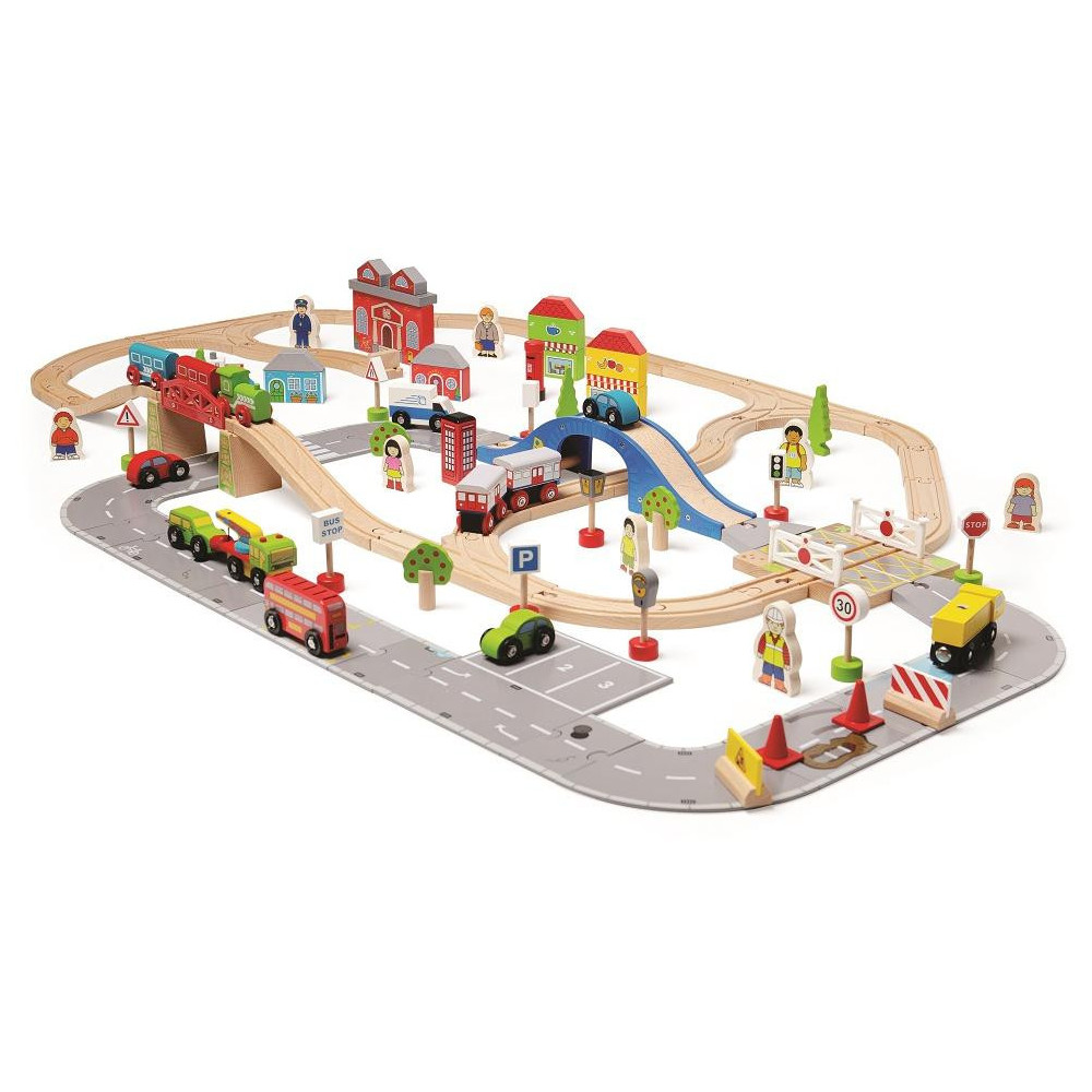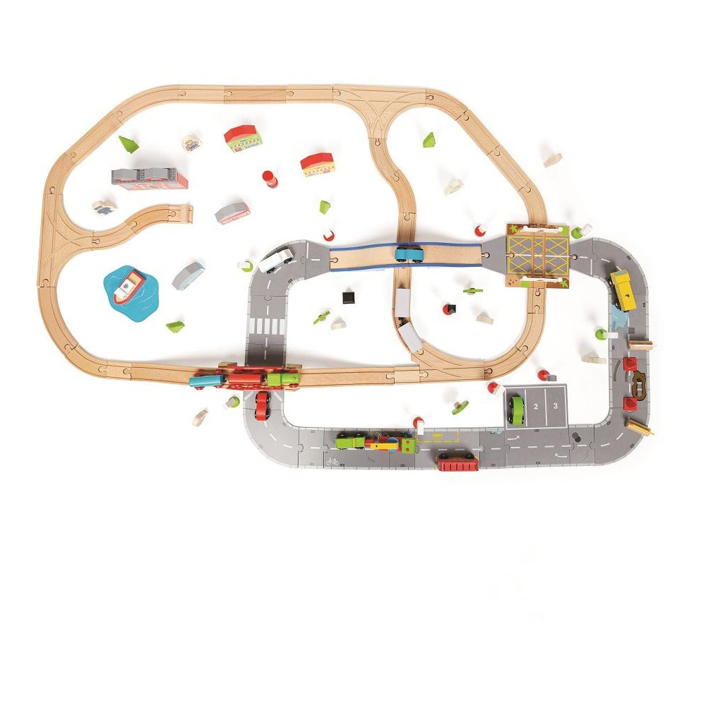 Tento rozsáhlý dřevěný set nabízí prostor pro hru s představivostí, obsahuje hodně doplňků, které upoutají pozornost dětí. Vlaky a auta se potkají na křižovatce železničního přejezdu, cestující čekají ve vlakové stanici, set má dokonce loď, která pasažéry přenese přes jezero! Propojuje koleje a cesty a tak si děti mají pořád s čím hrát. K rozšíření setu je možno dokoupit další doplňky.