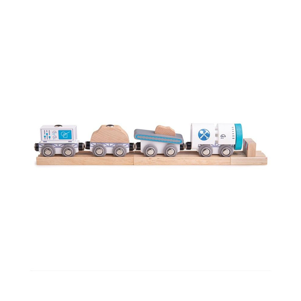 Čtyři magnetické vláčky se snadno připojí k sobě a jsou připraveny vyjet během několika sekund. Tato dřevěná souprava vlaků je dodávána se dvěma kusy kolejí a nárazníkem v případě nouzového zastavení.