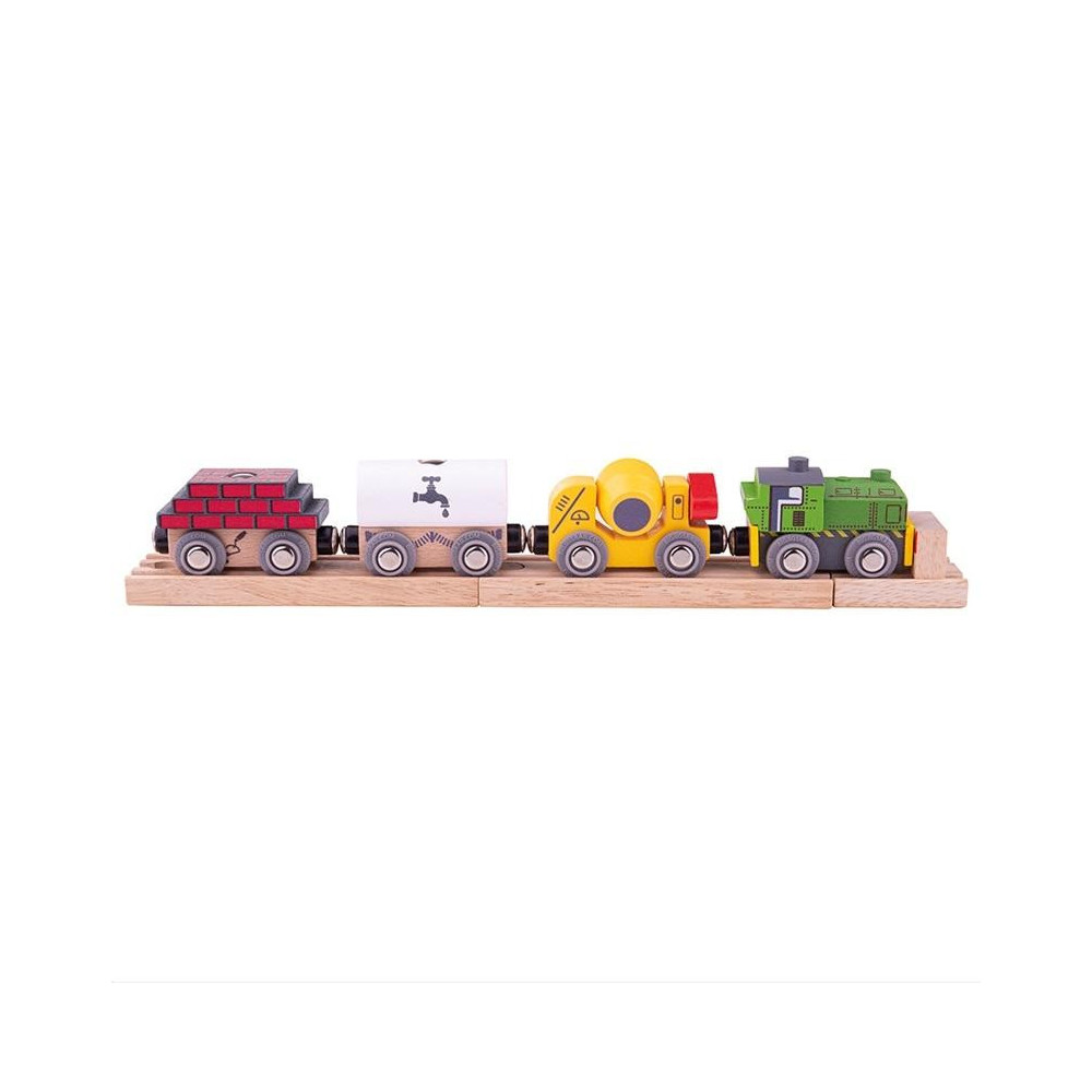Je to únavná práce na staveništi? Stavební vláček je tu, aby vám pomohl s těžkým zvedáním! Nalož dřevěný vlak a doruč dělníkům cihly, cement a vodu. Vše za chviličku. Stavební vláček je skvělým doplňkem jakékoli dřevěné vlakové soupravy. je 31,5 cm dlouhý a je dodáván se dvěma odnímatelnými náklady, třemi vagóny a zelenou mašinkou. Dřevěný vláček má magnetické spojky, které jej snadno spojí s jinými vláčky a vagóny.