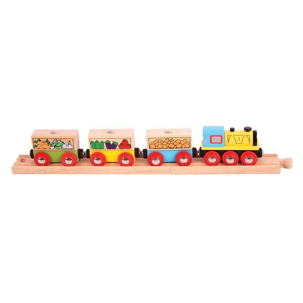 Tato veselá vlaková sada ovoce a zeleniny obsahuje jednu mašinku, tři vagónky a dva kusy dřevěných kolejnic. Pro větší zábavu se dá zboží z jednotlivých vagónků vyjmout. Kompatibilní s ostatními předními značkami dřevěných vláčkodráh.