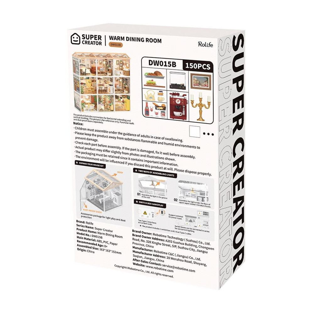 Kuchyň a jídelna jsou srdcem domova. U jídelního stolu se potkáváme se svými nejbližšími a u jídla si povídáme o životě, novinkách, svých zážitcích. Den začínáme šálkem kávy nebo čaje a snídaní a u jídelního stolu v kruhu rodiny náš den končí. Tento útulný jídelní kout v elegantním vintage stylu v krémové barvě s prostorným jídelním stolem je zobrazen do nejmenších detailů. Najdete zde příborník, stůl pokrytý ubrusem se 4 židlemi, pečivo, talířky, hrnečky, kávovar a další doplňky, které navozují atmosféru klidu a rodinné pohody, jako jsou obrázky na zdech, svícen či gramofon. Spojením různých miniatur řady Super Creator Series vertikálně nebo horizontálně můžete vytvořit různorodý komplex domečků. Ochraňte svůj výtvor pomocí krytů proti prachu a nečistotám – DWP05 Dveře proti prachu B a DWP02 Střecha typu B. Skládání skládačky podporuje rozvoj jemné motoriky, prostorového myšlení a trpělivosti. Je to možnost, jak kombinovat zábavu se vzděláváním. Všechny přesné dílky do sebe lehce zapadnou, aby výsledek byl stabilní a odolný, a to bez použití lepidla. Skládačka je dodávána v nesloženém stavu, zabalená v krabici s podrobným návodem k sestavení. Hlavní vlastnosti: 150 dílkůdoba skládání 45 minLED osvětleník napájení slouží kabel USB-C (je součástí balení)sestavení bez použití lepidlaatraktivní vzhledvhodné pro děti i dospělérozvíjí logické a motorické dovednostipodporuje trpělivost dětíideální jako dárek nebo jedinečná dekoracemožnost spojení více miniaturk dokoupení kryty proti prachu – DWP05 a DWP02