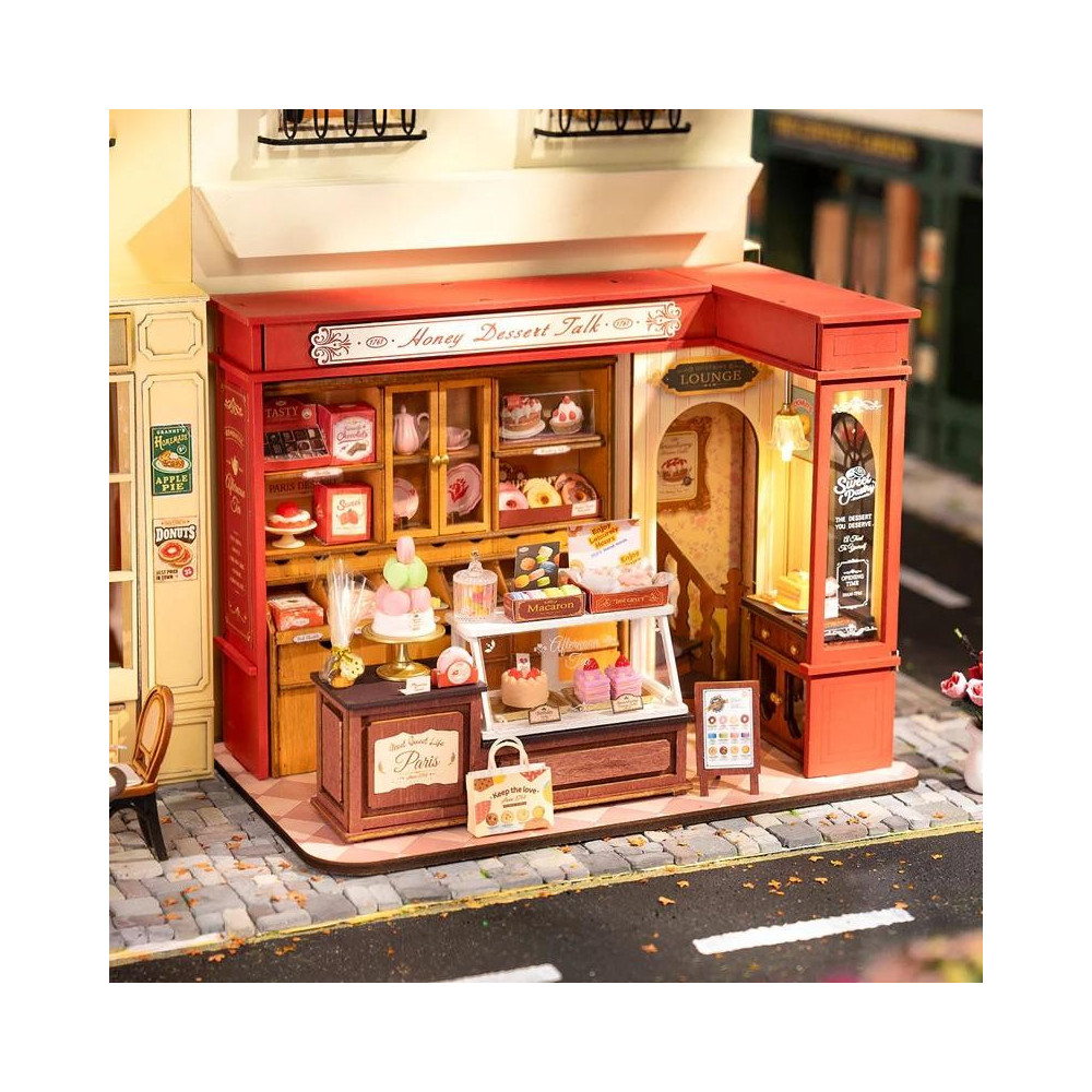 Je čas na něco sladkého! Vyberte si z vynikajících dezertů z nabídky útulné francouzské cukrárny, které jsou vystavené v dřevěných policích nebo skleněné vitríně. Nabídka je široká. Máte chuť na makronky, máslové sušenky, dortíky, čokoládu nebo donuty? Nebo si raději dáte čaj či kávu? V dóze jsou připraveny dokonce gumové bonbóny pro malé mlsouny! Dvířka skříněk jsou otevírací, takže si můžete zboží vystavit podle svého přání. Vychutnejte si atmosféru klidu a pohody, která je umocněna příjemným LED osvětlením. 3D skládačka je skvělý způsob, jak si užít kreativní a edukativní hraní a zároveň vytvořit nádherný model, který se může stát netradičním dárkem či ozdobou interiéru. Skládání 3D skládačky podporuje rozvoj jemné motoriky, prostorového myšlení a trpělivosti. Je to možnost, jak kombinovat zábavu se vzděláváním. Všechny přesně vyřezané dílky do sebe lehce zapadnou bez použití lepidla či nástrojů, aby výsledek byl stabilní a odolný. Skládačka je dodávána v nesloženém stavu, zabalená v krabici s podrobným návodem k sestavení. K napájení slouží 2x AAA /LR03/AM4 1,5 V (nejsou součástí balení). Hlavní vlastnosti: 242 dílkůdoba skládání 4 hodstřední obtížnost sestaveníLED osvětlenísestavení bez použití lepidla a nástrojůvýjimečný vzhledvhodné pro děti i dospělérozvíjí logické a motorické dovednostipodporuje trpělivost dětíideální jako dárek nebo jedinečná dekoracenapájení pomocí 2x AAA /LR03/AM4 1,5 V (nejsou součástí balení)