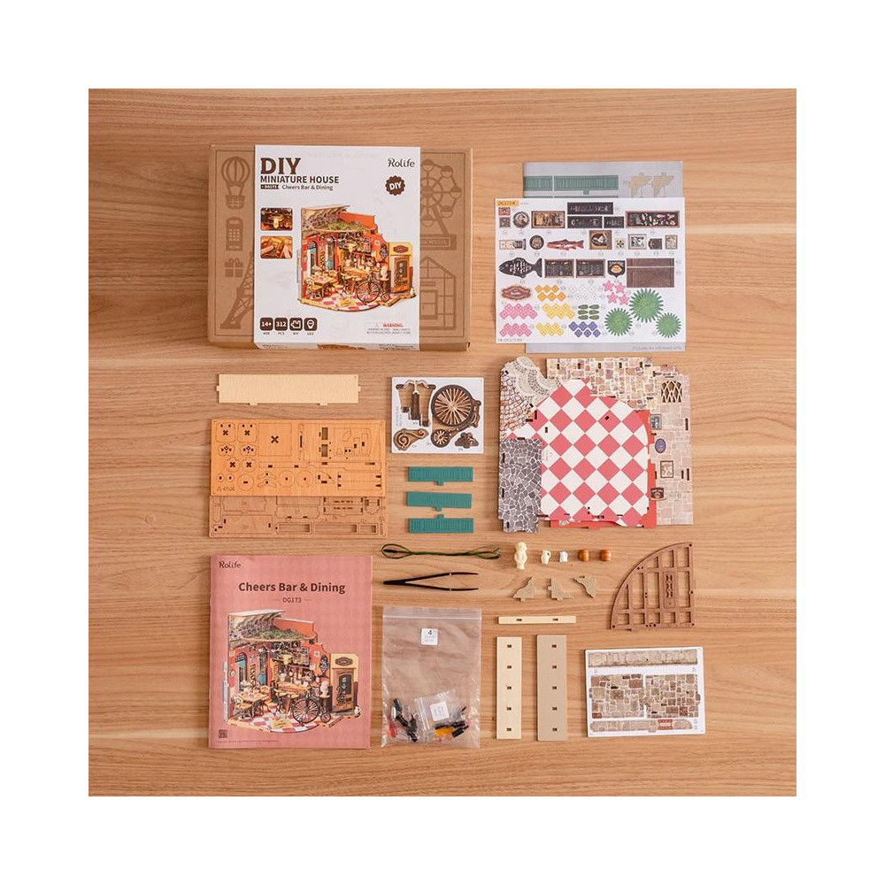 Uvolněte se a užijte si atmosféru stylového baru a bistra, které Vás okouzlí svou nostalgickou atmosférou. Uvnitř Vás čeká pohodlné posezení, oblouková okna, elegantní barový pult a řada lahví vína, a to vše vytvářejí intimní a přívětivou atmosféru. Tabule s denní nabídkou jsou rozestavené po celém interiéru a lákají na speciality kuchyně. Každá stěna je ozdobena retro plakáty a nechybí ani klasické dekorace jako vysoký starodávný velociped, socha na podstavci nebo dřevěné cedulky, které dohromady vytvářejí důvěrně známý útulný evropský styl. Kombinace LED lampičky a drobných stropních světýlek navozuje domáckou atmosféru pohody. 3D skládačka je skvělý způsob, jak si užít kreativní a edukativní hraní a zároveň vytvořit nádherný model, který se může stát netradičním dárkem či ozdobou interiéru. Skládání podporuje rozvoj jemné motoriky, prostorového myšlení a trpělivosti. Je to možnost, jak kombinovat zábavu se vzděláváním. Všechny přesně vyřezané dílky do sebe lehce zapadnou bez použití lepidla či nástrojů, aby výsledek byl stabilní a odolný. Skládačka je dodávána v nesloženém stavu, zabalená v krabici s podrobným návodem k sestavení. K napájení slouží 2 AAA baterie (nejsou součástí balení). Hlavní vlastnosti: 312 dílkůdoba skládání 5 hodinměřítko 1 : 18střední obtížnost sestaveníLED osvětlenísestavení bez použití lepidla a nástrojůvýjimečný vzhledvhodné pro děti i dospělérozvíjí logické a motorické dovednostipodporuje trpělivost dětíideální dárek nebo jedinečná dekoracenapájení pomocí 2x AAA /LR03/AM4 1,5 V (nejsou součástí balení)