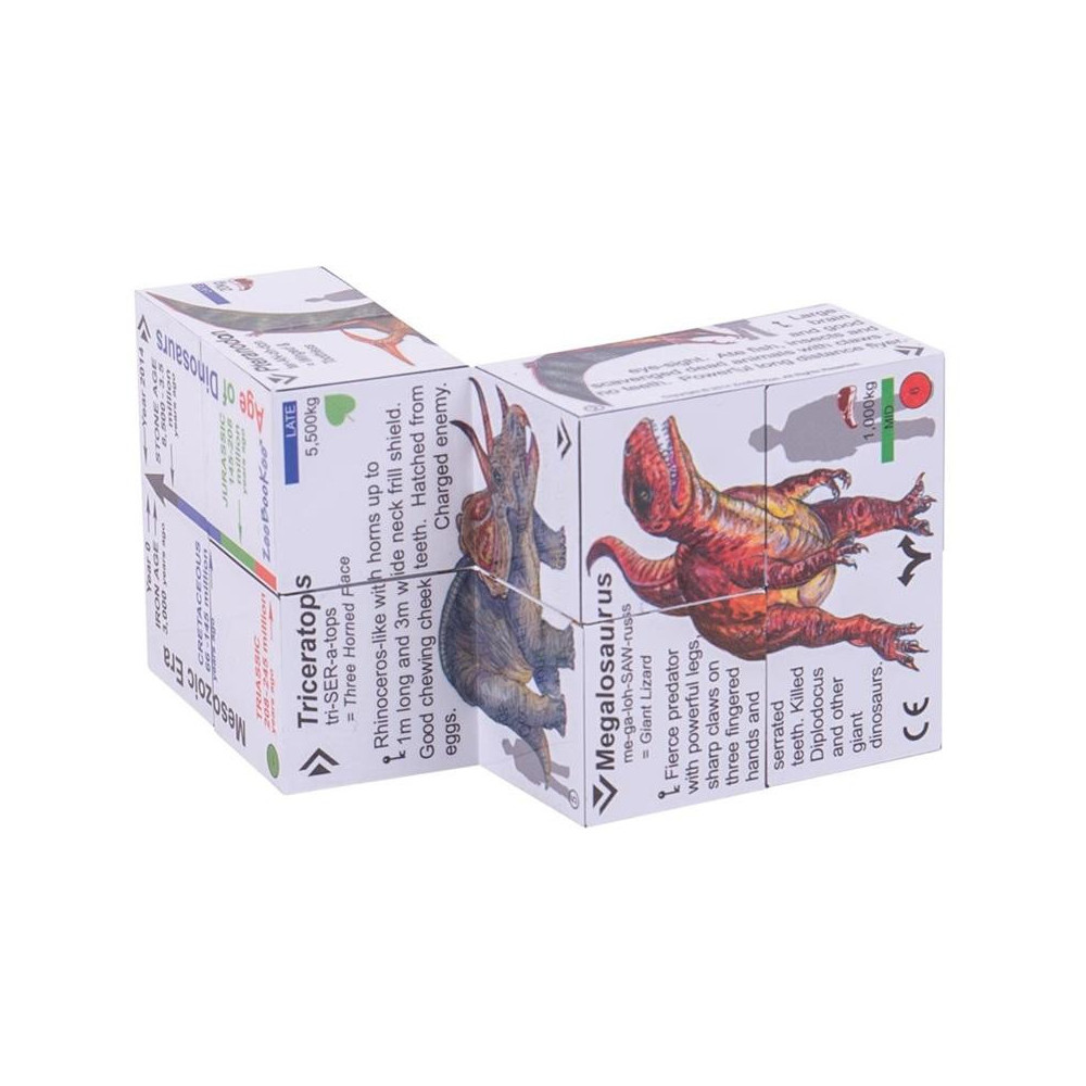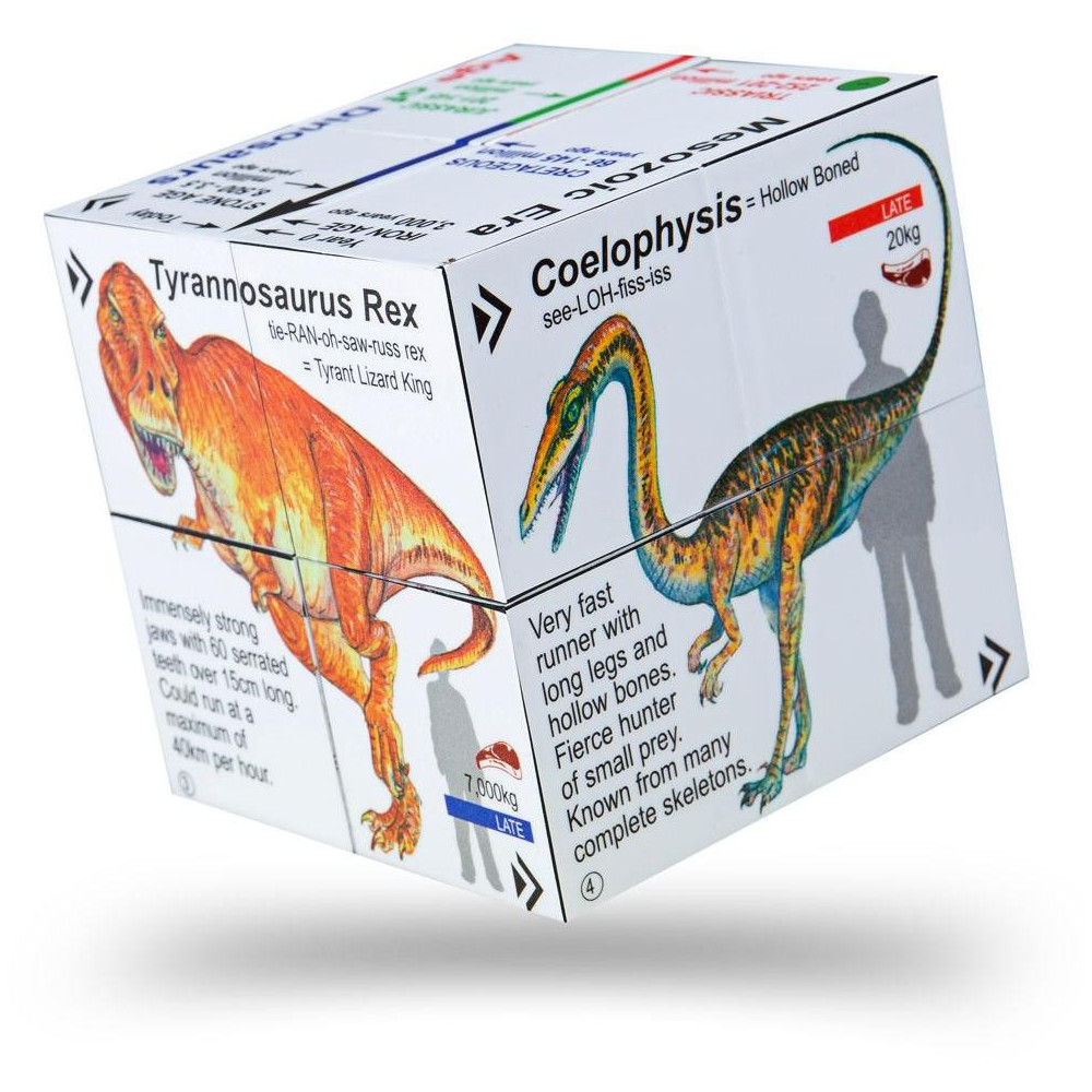 Didaktická kostka se skládá ve všech směrech a v mnoha kombinacích. Popisky na kostce jsou v angličtině. V každé kombinaci složení najdou děti jiného dinosaura a k němu zajímavé informace. Nechybí samozřejmě ani oblíbený Tyranosaurus Rex, Spinosaurus nebo Pterandon. Skvělé pro použití ve školách, doma i na cestách. Splňuje aktuální evropské bezpečnostní normy. Hlavní vlastnosti: zajímavý způsob, jak se dozvědět vše o svých oblíbených dinosaurechobsahuje fakta o tom, co jedli, kdy žili a jak vyslovovat jejich jménazábavné učení