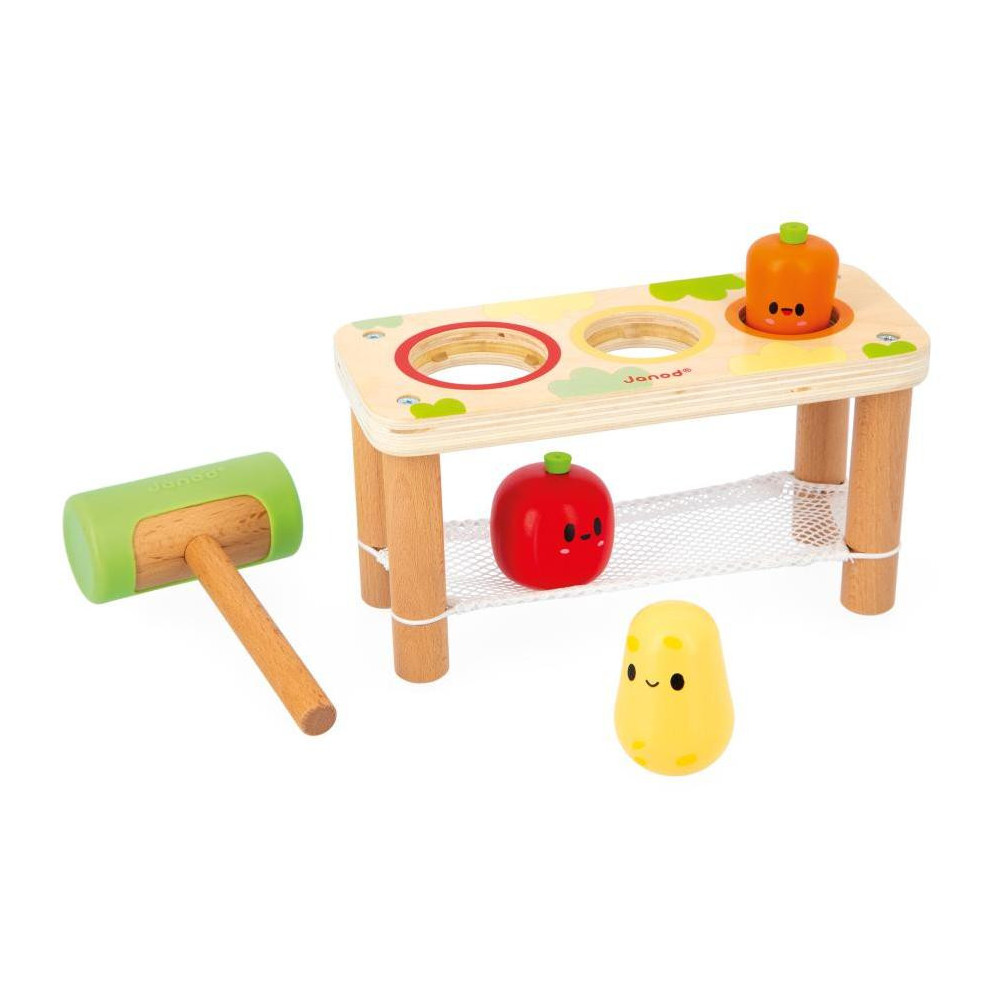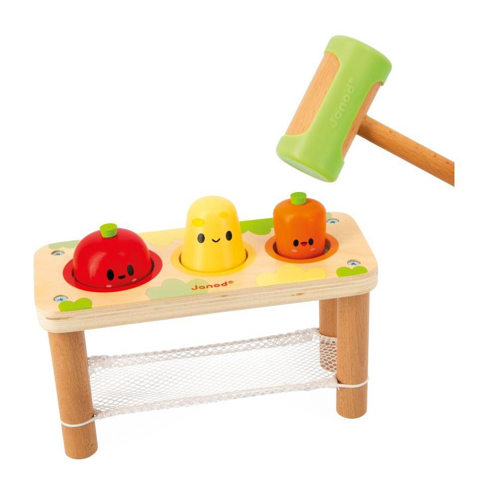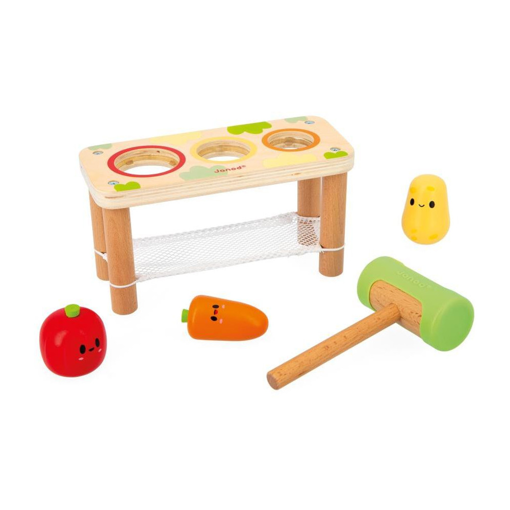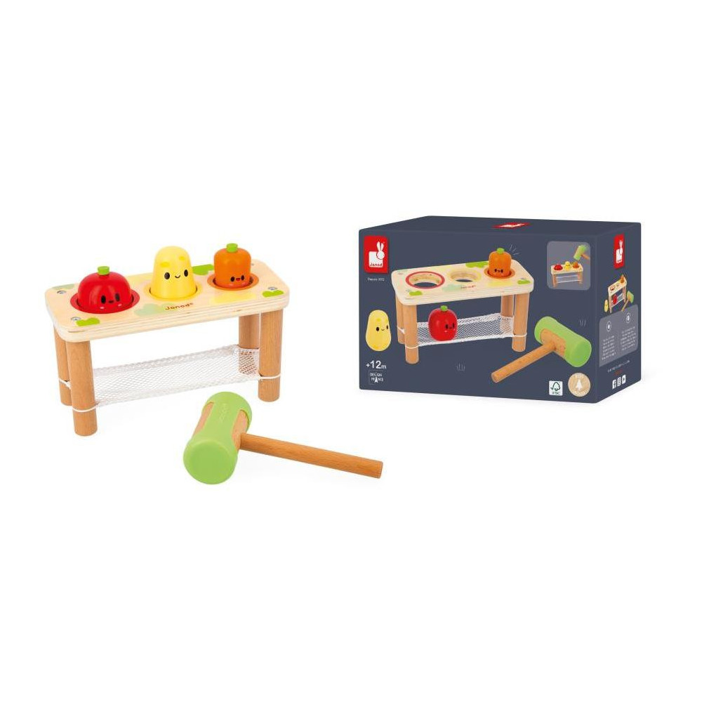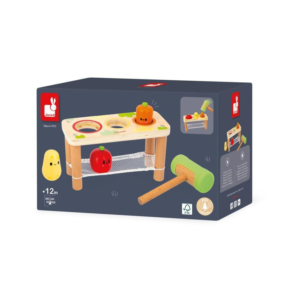 Je čas zberu úrody, tak sa bavte, že zelenina padne do ich siete! Hračka sa skladá zo stojana so sieťkou, paradajky, zemiaka, mrkvy a dreveného kladiva. Cieľom hry je umiestniť každú zeleninu do jej štrbiny a potom ju prinútiť spadnúť do siete úderom kladiva. Vďaka silikónovému plášťu kladivo pri hre vydáva obmedzený hluk, čo je praktické! Táto hračka umožní vášmu dieťaťu spoznávať zeleninu a rozvíjať zručnosť a zároveň sa zabávať. Ideálne pre chvíle smiechu a učenia! Hračka vyrobená z dreva s certifikátom FSCTM.